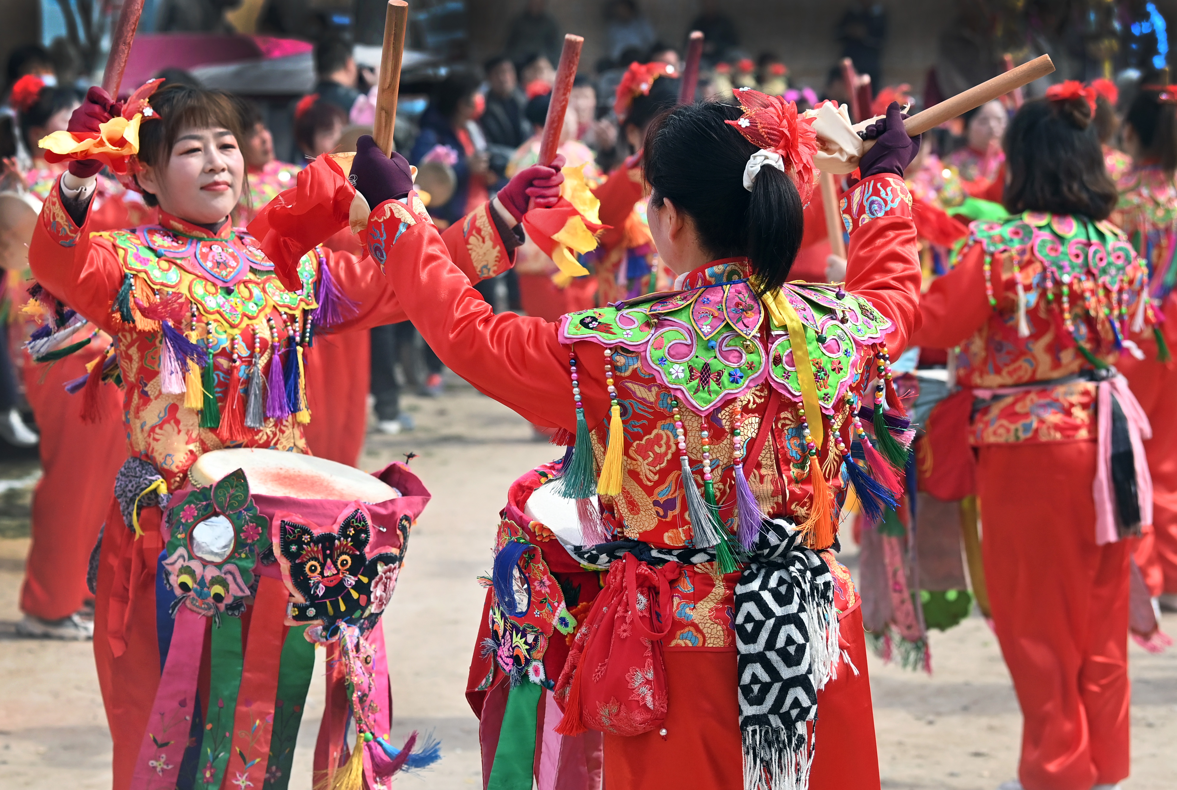 新华社照片,渭南(陕西),2022年3月4日 黄河岸边“文化村”里赛社火 3月3日,阿寿村村民在进行花苫鼓表演。花苫鼓是用刺绣服饰将鼓围起来进行表演的一种民间舞蹈。 地处黄河之滨的陕西省渭南市大荔县羌白镇阿寿村,经历过千年的时光侵蚀,留给了后人丰富文化财富,是远近闻名的“文化艺术村”。全村80%的村民都有跑汉车、花苫鼓表演和面花制作的本领。 近年来,在振兴乡村的建设中,当地政府因势利导,对该村的“二月二庙会”民俗事项进行了搜集、挖掘、整理,面花、花苫鼓、跑汉车等民俗均申报获得省市以上非物质文化遗产保护项目。同时,发挥群众热爱传统文化的积极性,保护老艺人、培养传承人,营造出一片保护、传承、弘扬黄河文化的新天地。 新华社记者 陶明 摄
