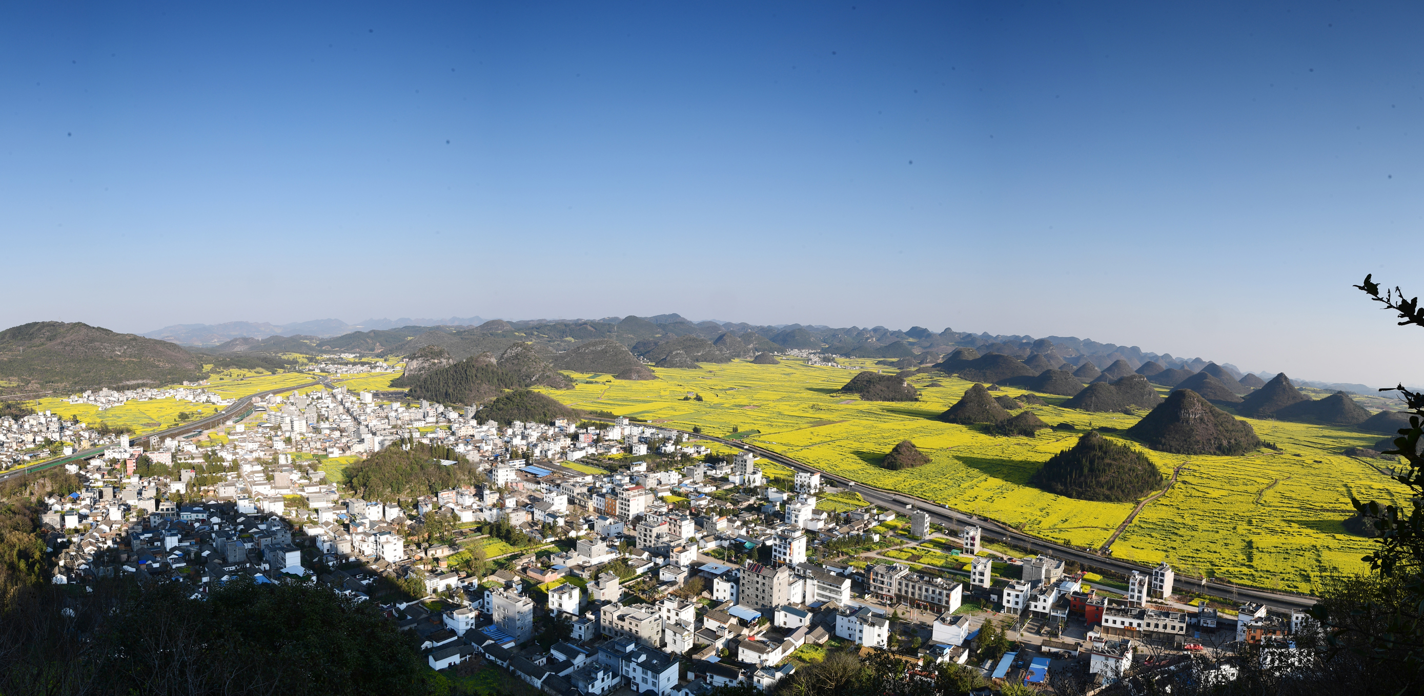 新华社照片,罗平(云南),2022年3月4日 云南罗平:振兴路上花正香 2月28日拍摄的罗平县板桥镇金鸡村。 近日,云南省罗平县的100万亩油菜花迎春盛开,黄花、碧水、群山、村舍相映成趣,透出浓浓春意,吸引游客前来赏花游玩。 近年来,云南省曲靖市罗平县以花为媒,打造“农业+旅游”农旅融合新业态,逐步形成“农旅结合、以农促旅、以旅兴农”的产业格局,带动群众增收致富,助推乡村振兴。 2021年全县油菜产量16.2万吨,产值近10亿元;全县接待游客795.08万人次,旅游综合收入61.2亿元;全县蜜蜂养殖2000余户,蜂蜜产量2000余吨,农旅融合协调发展,为乡村振兴提供坚实发展基础。罗平县板桥镇金鸡村依托油菜花发展乡村旅游,农民人均纯收入达23600元,成为罗平县乡村振兴的示范村。 新华社发(毛虹摄)