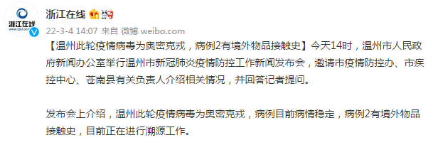 发布会上介绍,温州此轮疫情病毒为奥密克戎,病例目前病情稳定,病例2有境外物品接触史,目前正在进行溯源工作。