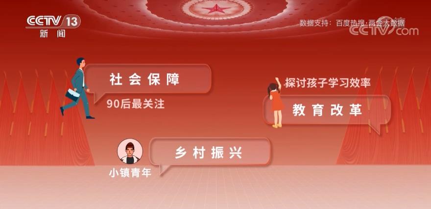委员们积极参政议政,网友们也多方建言献策。国家信息中心数据显示,连日来,与“两会”相关的话题讨论热度持续攀升。到发布会召开时,声量比三天前增加了91%。在网友关注的话题榜单中,“社会保障”在“90后”人群里最受关注,“教育改革”引发了对孩子学习效率的探讨,“乡村振兴”牵动小镇青年的心,天南海北、关乎百姓切身利益的话题,汇聚成了网友们对两会的满满期待。