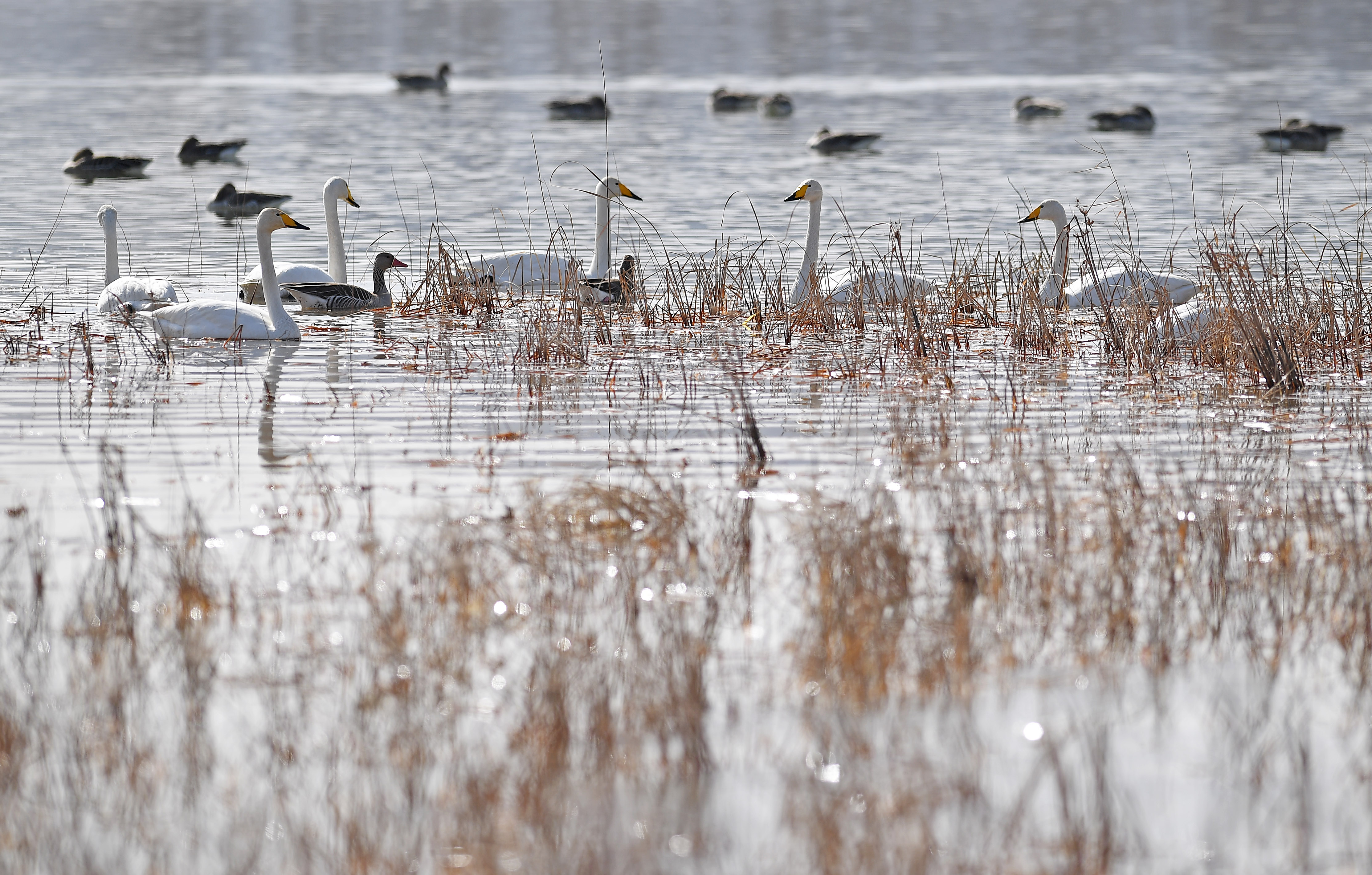 新华社照片,银川,2022年3月4日 宁夏中卫:黄河湿地迎来大天鹅 栖息在中卫市香山湖国家湿地公园的大天鹅(3月2日摄)。 随着气温逐步回升,宁夏中卫市香山湖国家湿地公园迎来二十多只大天鹅在此栖息、觅食。据了解,中卫市近年来积极实施推进宁夏黄河流域生态保护和高质量发展先行区建设,在黄河生态整治、滩区治理等一系列措施实施下,黄河湿地生态环境明显改善,每年春秋季节都会迎来大批候鸟来此驻足。 新华社记者 王鹏 摄