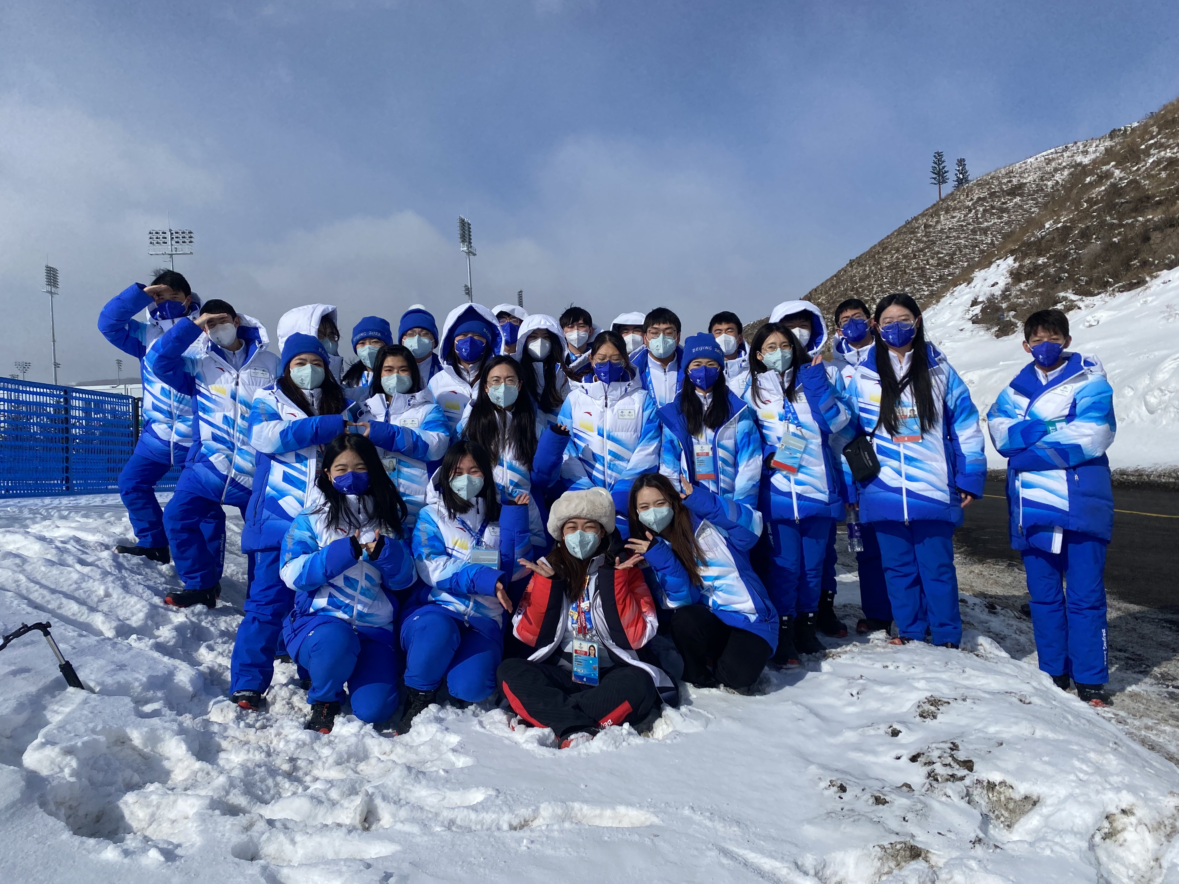 河北工业大学冬奥会志愿者团队部分成员在冬奥会赛场外合影。受访者供图