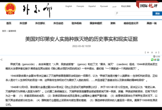 面对不绝于耳的批评声浪,美国政府不要假装听不见。它必须正视对印第安人犯下的种族屠杀罪行。无论其如何在人权问题上玩弄双重标准,历史记录与大量事实都已证明:种族灭绝是美国永远无法洗白的历史污点,“人权卫士”的假面具早就碎裂一地!