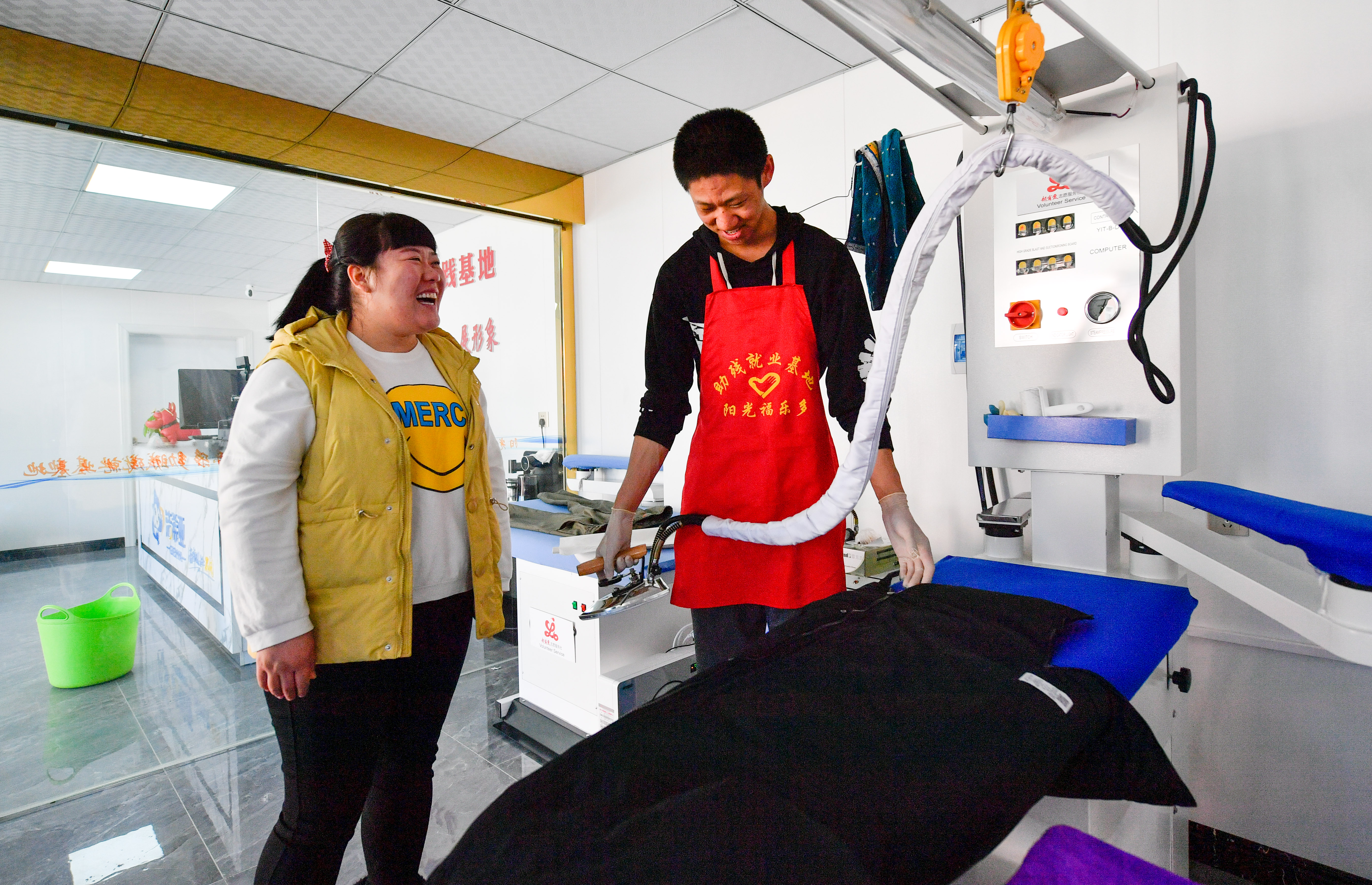 新华社照片,天津,2022年3月4日 为了49个残障青年——走进阳光福乐多助残就业基地 在天津市宝坻区阳光福乐多助残就业基地,田丽超(左)与一名残障青年交流(3月1日摄)。 在天津市宝坻区史各庄镇的一个特殊大院内,49个平均年龄不到23岁的残障青年在这里工作、生活。智力障碍、视力障碍等残障问题曾让他们自卑、自闭,如今在田丽超的帮助下,他们越来越阳光、自信。 2016年的一天,田丽超在路上遇到了一个走失的智力残疾女孩,与小女孩所在的培智学校校长了解后,她意识到,残障孩子未来面临的难题之一就是就业。 之后的几年,田丽超一直在想办法帮助这些残障孩子。2019年7月2日,田丽超收养的第一批孩子成年后,她带着他们成立了名为“阳光福乐多”的助残就业基地。起初,她只能教他们配装洗衣粉,做肥皂、墩布等简单劳动。之后,这些残障青年在田丽超的帮助下干起了干洗店,与人接触也越来越自信,不再惧怕和陌生人讲话。 “这些年轻人大多都存在着自闭症等心理疾病,长期在封闭的环境中生活他们会越来越自闭。”田丽超说,“我们是一家人,我希望通过这种方式让他们更快乐自信。” 现如今,田丽超已和这些残障青年成立了“超有爱志愿服务社”“超有爱洗衣店”和“超有爱物业有限公司”,她也正在帮助更多的残障青年走出去,更好地融入社会。 不仅如此,田丽超领着他们与多个村庄建立了志愿服务合作,给困难村民洗衣服、做被子、开展文艺演出等。如今,这群年轻人早已颠覆了人们的刻板印象,用辛勤劳动,感动了不少人。 与这群年轻人在一起,田丽超脸上始终洋溢着幸福的笑容。她说,希望他们能够养活自己,快乐自信,打心底觉得自己是对社会有用的人。 从因为智力缺陷而自卑、自闭,到懂礼貌、有一技之长受人尊重,田丽超用爱和耐心,让这群年轻人自信地生活在阳光下。 2021年7月,田丽超被国务院残疾人工作委员会评为“全国残疾人工作先进个人”。 新华社记者 孙凡越 摄