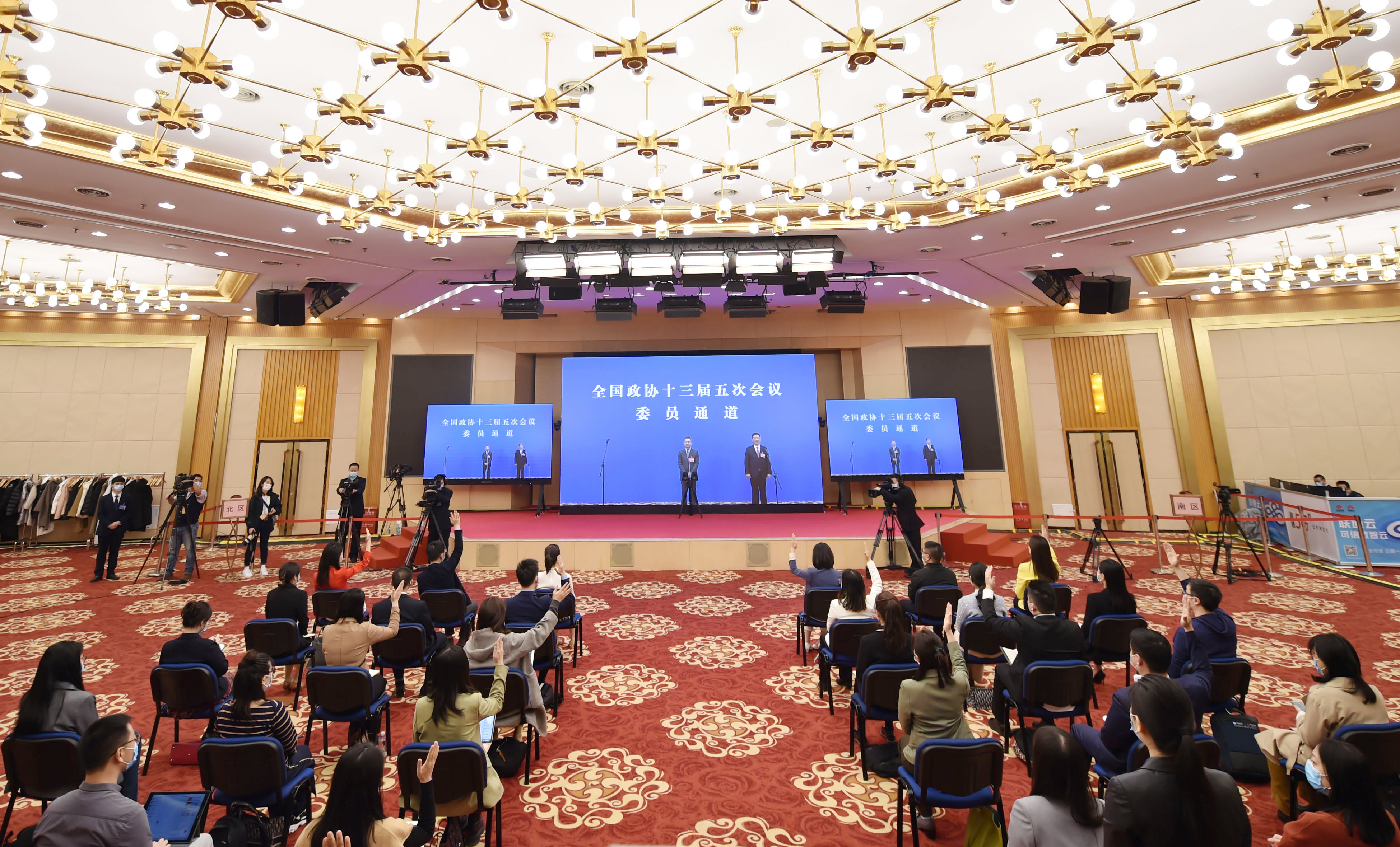 新华社照片,北京,2022年3月4日 接受采访 3月4日,全国政协十三届五次会议第一场“委员通道”采访活动在北京人民大会堂新闻发布厅举行。这是分会场。 新华社记者 陈钟昊 摄