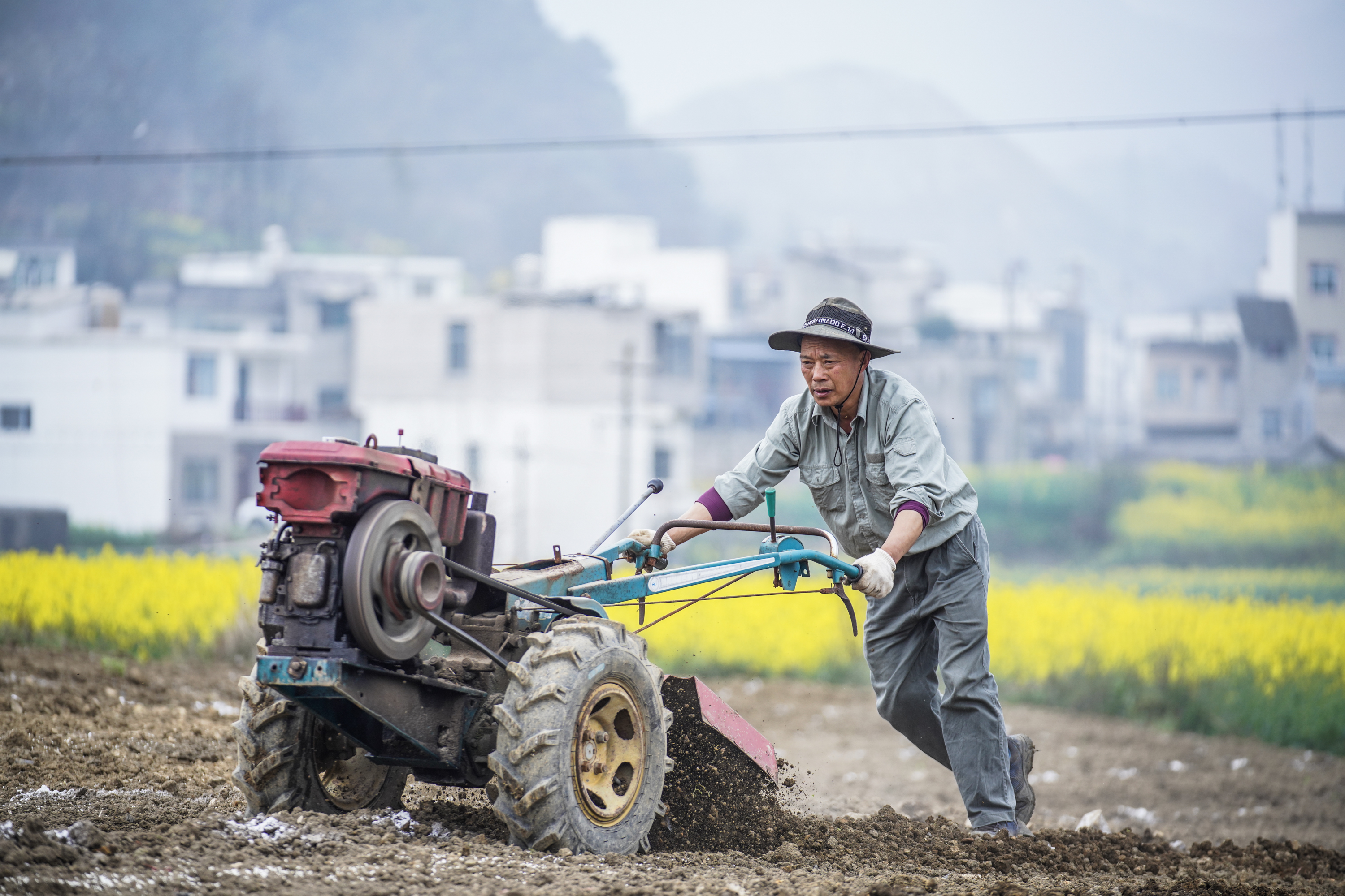 新华社照片,六枝(贵州),2022年3月4日 惊蛰将至农事忙 3月4日,六枝特区郎岱镇驿陇村农户在犁地。 惊蛰节气将至,贵州省六盘水市六枝特区农户抢抓农时,开展春播耕地、土地管护、田地施肥等农事活动,田间地头一派繁忙。 新华社记者 陶亮 摄