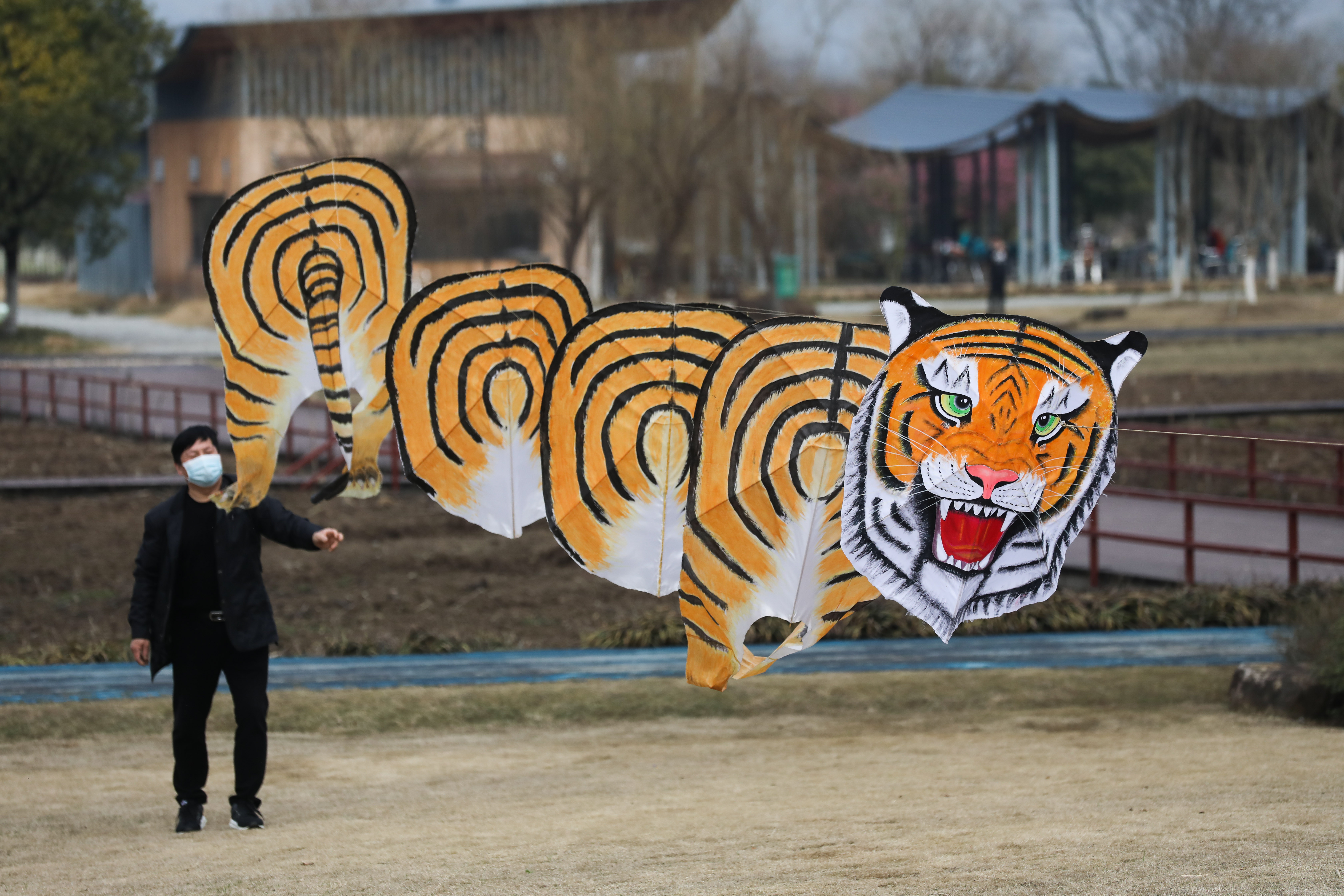 新华社照片,杭州,2022年3月4日 巨型“茶龙”风筝扮靓春日 3月4日,游客在径山镇径山花海景区放飞老虎风筝。 当日,浙江省杭州市余杭区径山镇举办了“二月二”宋韵风筝节暨“茶龙”风筝放飞活动。“茶龙”风筝的龙身由156片茶叶形状的小风筝组成,寓意径山镇特色茶产业蒸蒸日上,这既是对杭州传统宋韵文化的继承和发展,也是希望用放飞“茶龙”风筝的形式,祈愿新年风调雨顺。活动现场还有各种风筝放飞表演,风筝制作精美、形象生动有趣、放飞在天空中活灵活现,为春日增添一道靓丽的风景线。 风筝在杭州俗称“鸢儿”,杭州民间的风筝制作工艺发达,自古以来放风筝就是非常受欢迎的传统游戏项目。 新华社记者 徐昱 摄