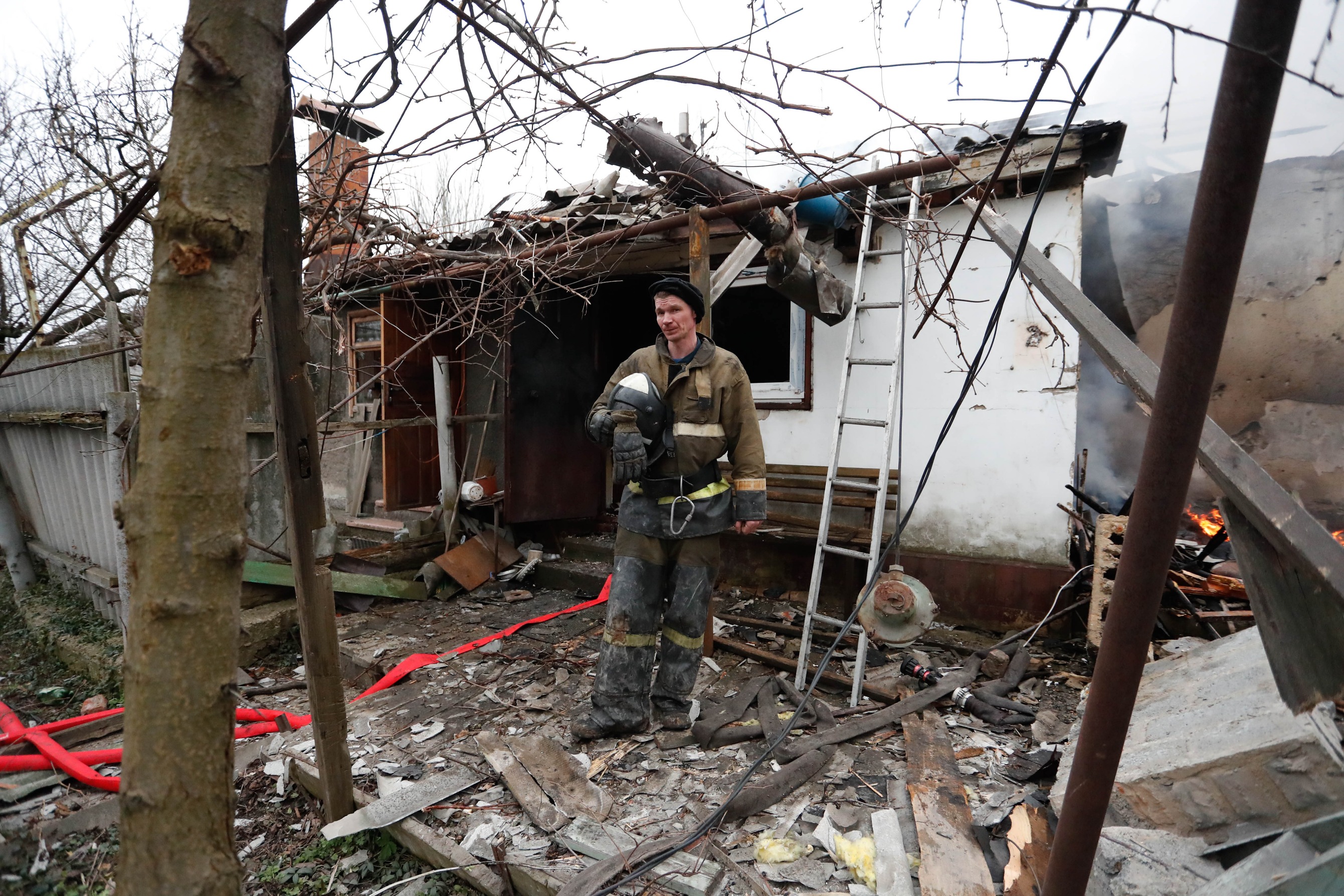 2月28日,在顿涅茨克,一名消防员站在损坏的房屋前。新华社发(维克多摄)