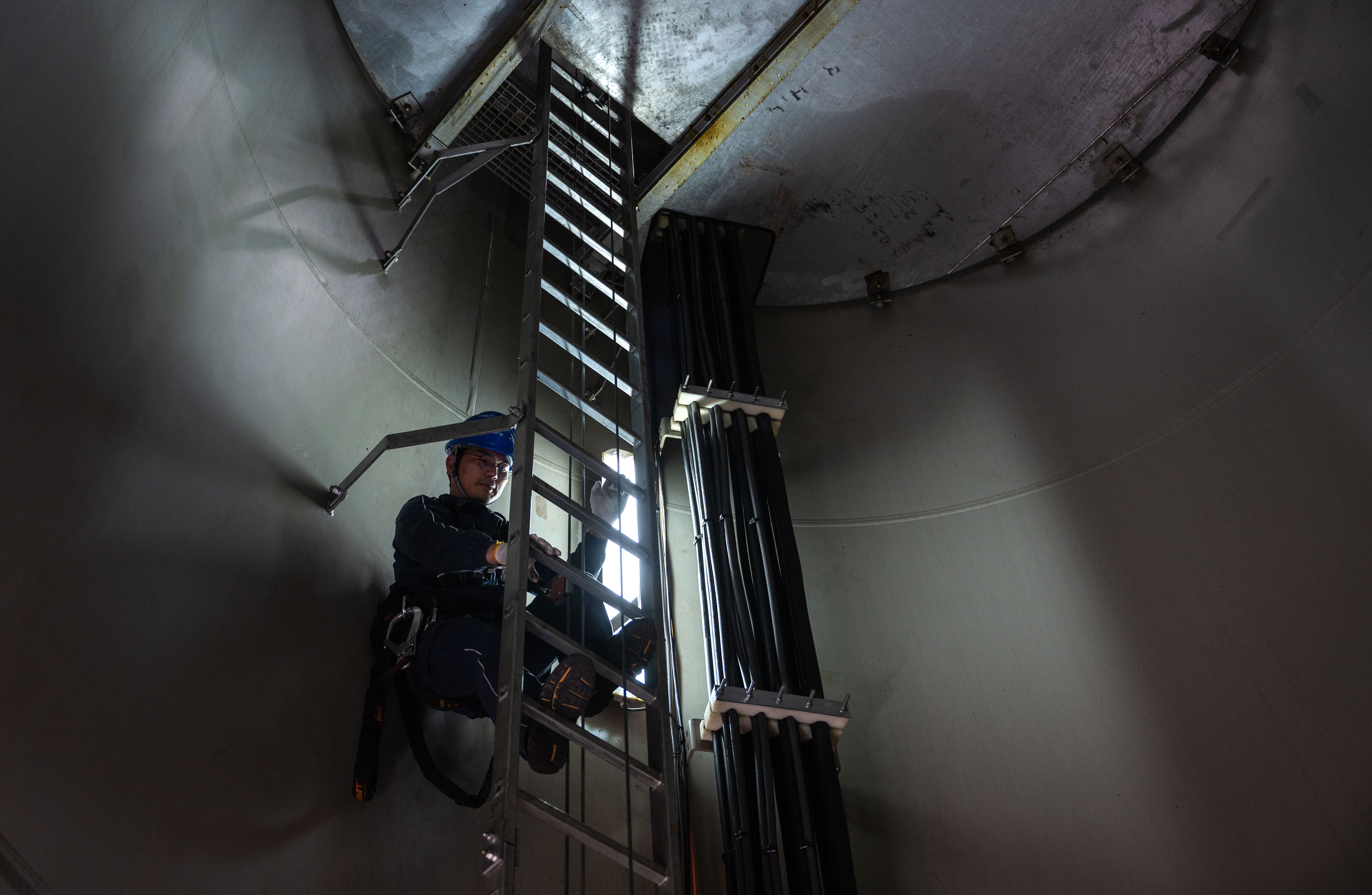 新华社照片,华宁(云南),2022年3月4日 云南华宁:风力发电助推绿色发展 3月3日,在云南省华宁县,工作人员检查风机内设施。 近年来,云南省华宁县依托地区自然资源优势发展风力发电项目,有效助推当地绿色发展。目前,依托国家重点新能源企业,当地已建成稳定运行的磨豆山、将军山、大丫口3个风电场项目。 新华社记者 王冠森 摄