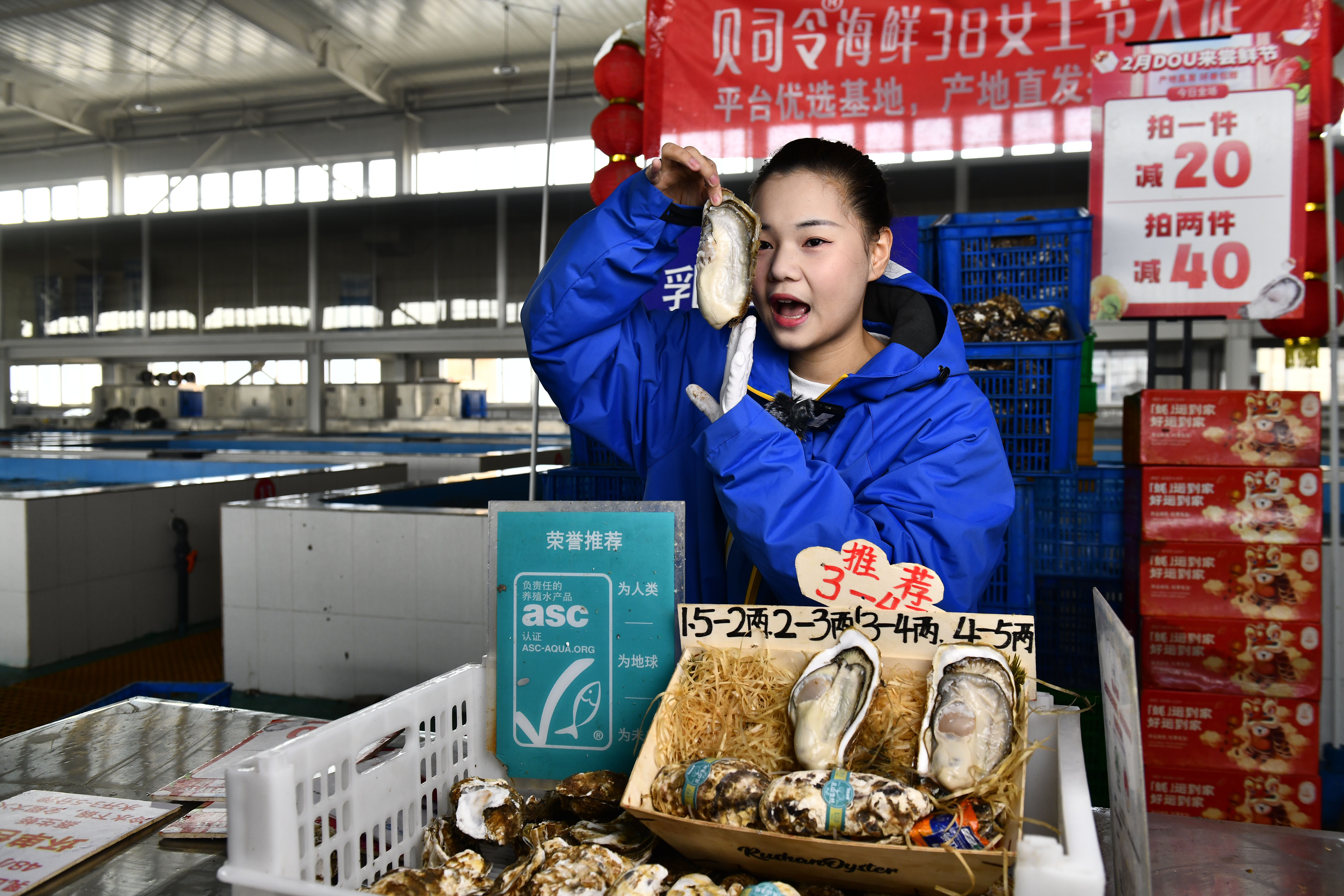 新华社照片,威海,2022年3月4日 山东乳山:发展牡蛎产业 助力乡村振兴 3月4日,在乳山市海阳所镇,一名主播通过电商平台推介乳山牡蛎。 山东省乳山市依托海洋优势资源,大力发展牡蛎产业,形成了育苗育种、养殖、销售和文化旅游产业链,牡蛎产业已成为当地乡村振兴的主导产业。 新华社记者 郭绪雷 摄