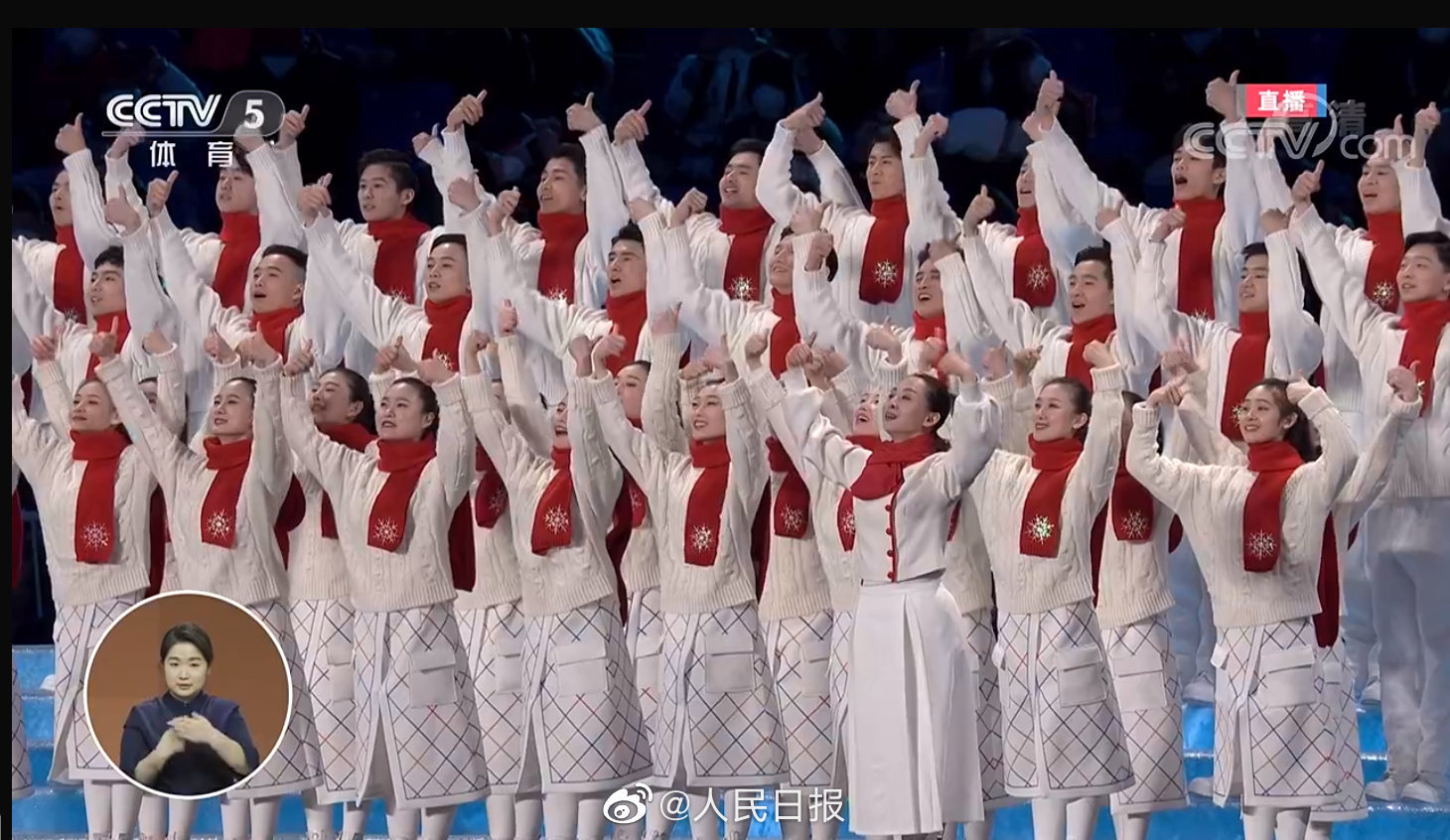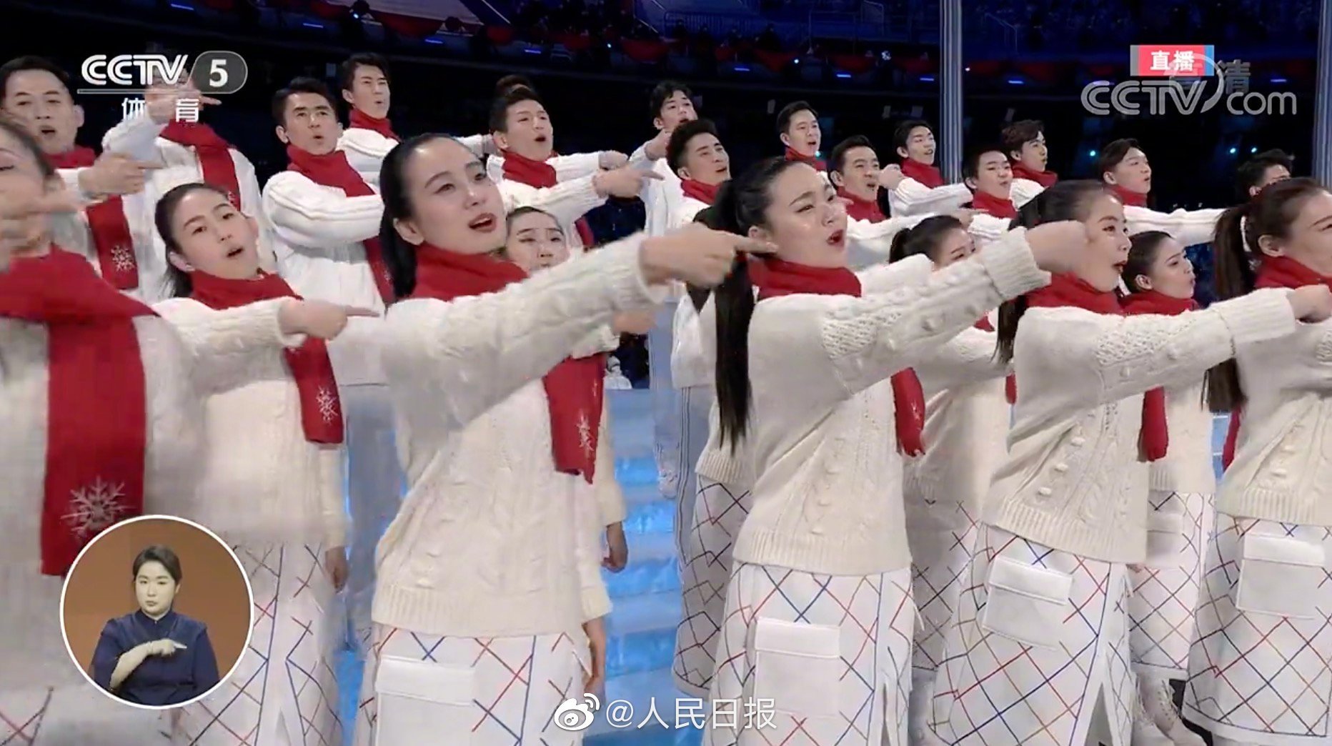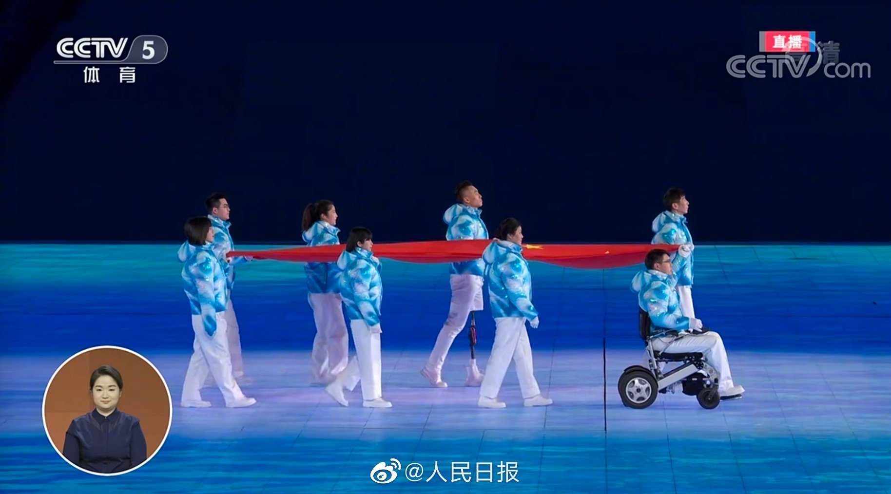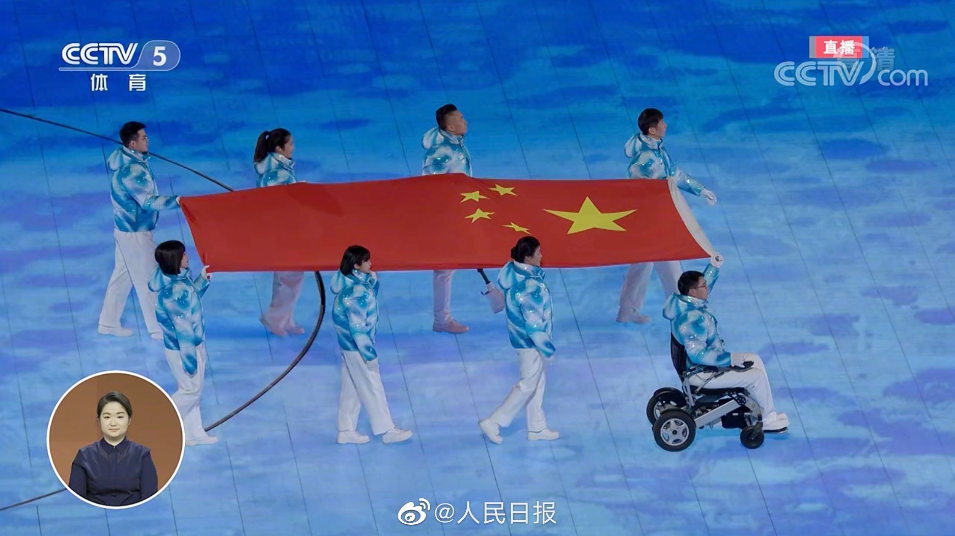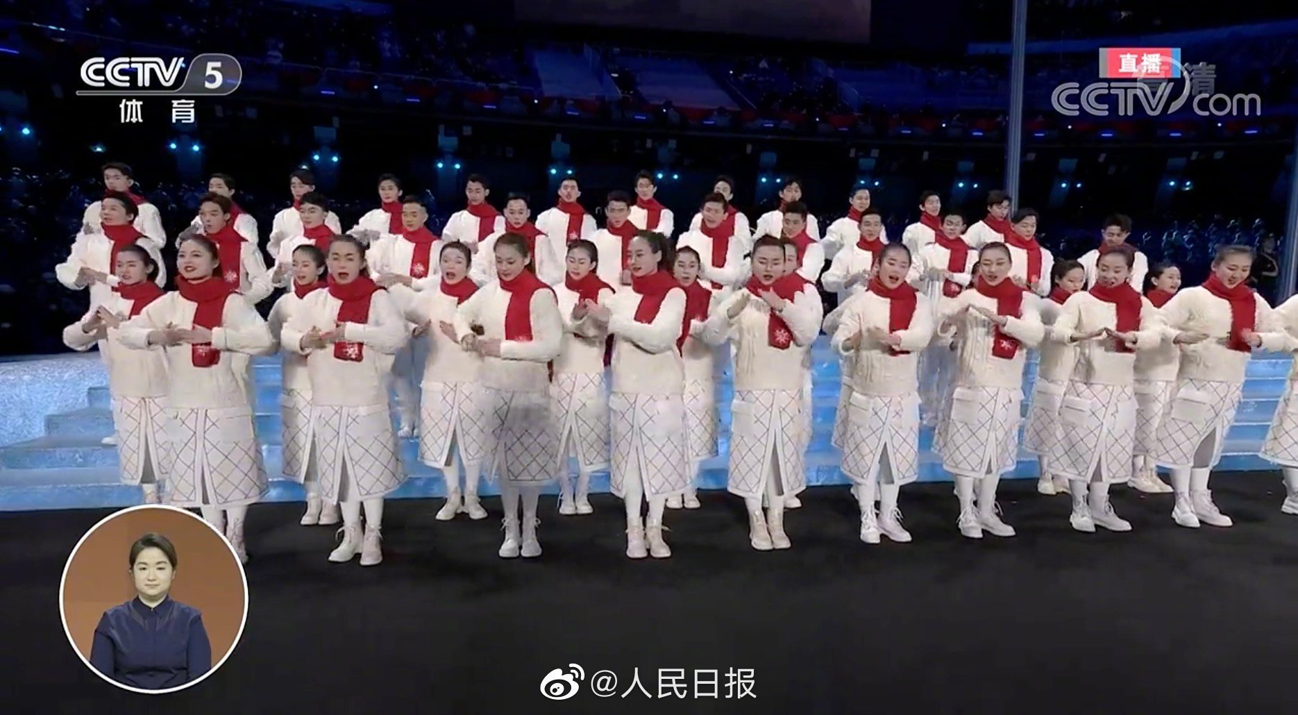 旗台两侧,24名大学生深情唱响《我和我的祖国》,迎接国旗。他们利用业余时间排练和参加冬残奥会开幕式的表演,以无伴奏合唱的形式,唱响对祖国的热爱。