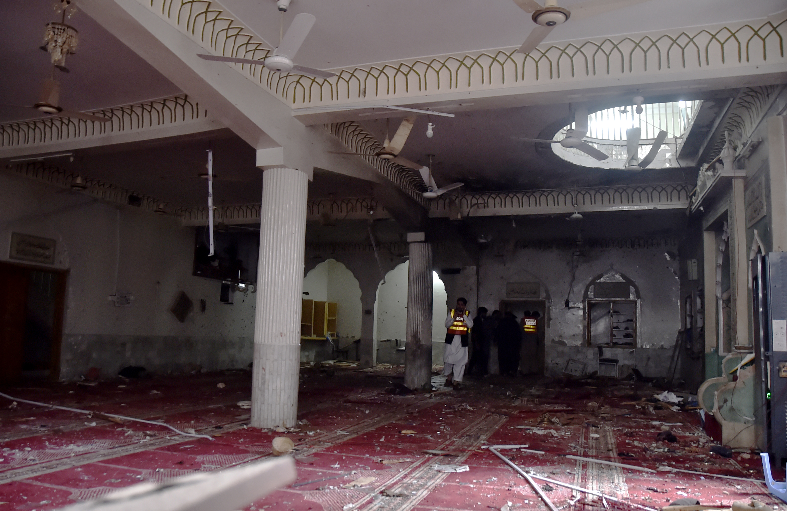 新华社照片,白沙瓦(巴基斯坦),2022年3月4日 (国际)(7)巴基斯坦西北部发生爆炸袭击至少45人死亡 3月4日,救援人员在巴基斯坦白沙瓦遭袭清真寺查看受损情况。 巴基斯坦西北部开伯尔-普什图省首府白沙瓦市一座清真寺4日发生爆炸袭击事件,造成至少45人死亡、65人受伤。 新华社发(赛义德·艾哈迈德摄)