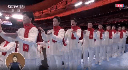 舞台一侧的手语方阵中,残疾人演员们深情地用手语“唱”着国歌,带给人们心灵的震撼。