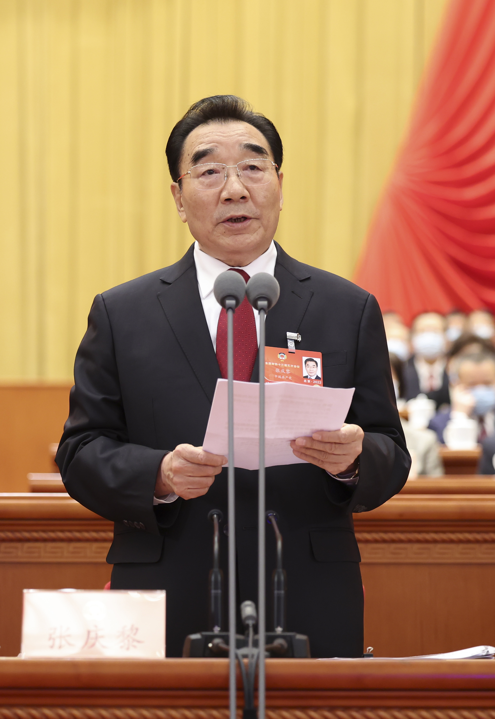 新华社照片,北京,2022年3月4日 全国政协十三届五次会议在京开幕 3月4日,中国人民政治协商会议第十三届全国委员会第五次会议在北京人民大会堂开幕。全国政协副主席张庆黎主持开幕会。 新华社记者 黄敬文 摄
