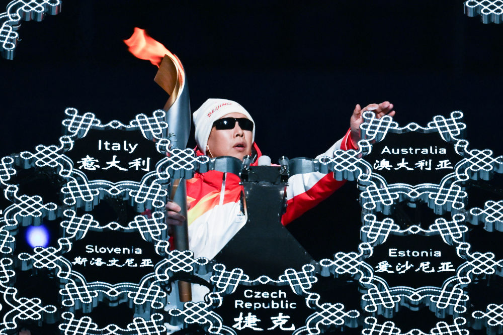 最后一棒火炬手、盲人运动员李端一步步走向“大雪花”造型的主火炬台,用他最有温度的感官能力——触摸,轻抚一片片小雪花。现场安静下来,观众仿佛能感受到他在触摸世界,认知世界。几经摸索,火炬终于插入主火炬台。一簇微光,烛照世界。