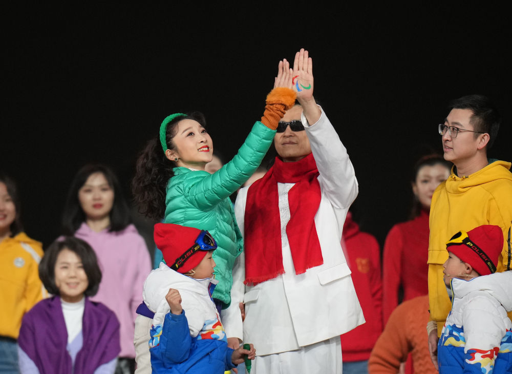 3月4日晚,北京2022年冬残奥会开幕式在北京国家体育场举行。这是一位盲人(右三)击掌“传递”手掌上的国际残奥委会标志。新华社记者吴壮摄
