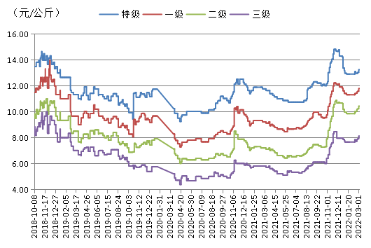 新疆产区方面,截至3月3日,与上周同期相比,一级、二级骏枣每公斤出货均价分别下跌0.11元和0.22元;特级灰枣每公斤出货均价下跌0.02元。调研显示,近期产区走货好于预期,下游市场补货需求较旺,枣企售枣信心增强,叠加本产季红枣产量缩减,库存不充裕,春节前后红枣价格并未如往年出现明显的调整,多数枣企价格持稳。售价偏高的骏枣及高等级灰枣随行情略有波动,未来短期,新疆产区红枣价格或将基本稳定。