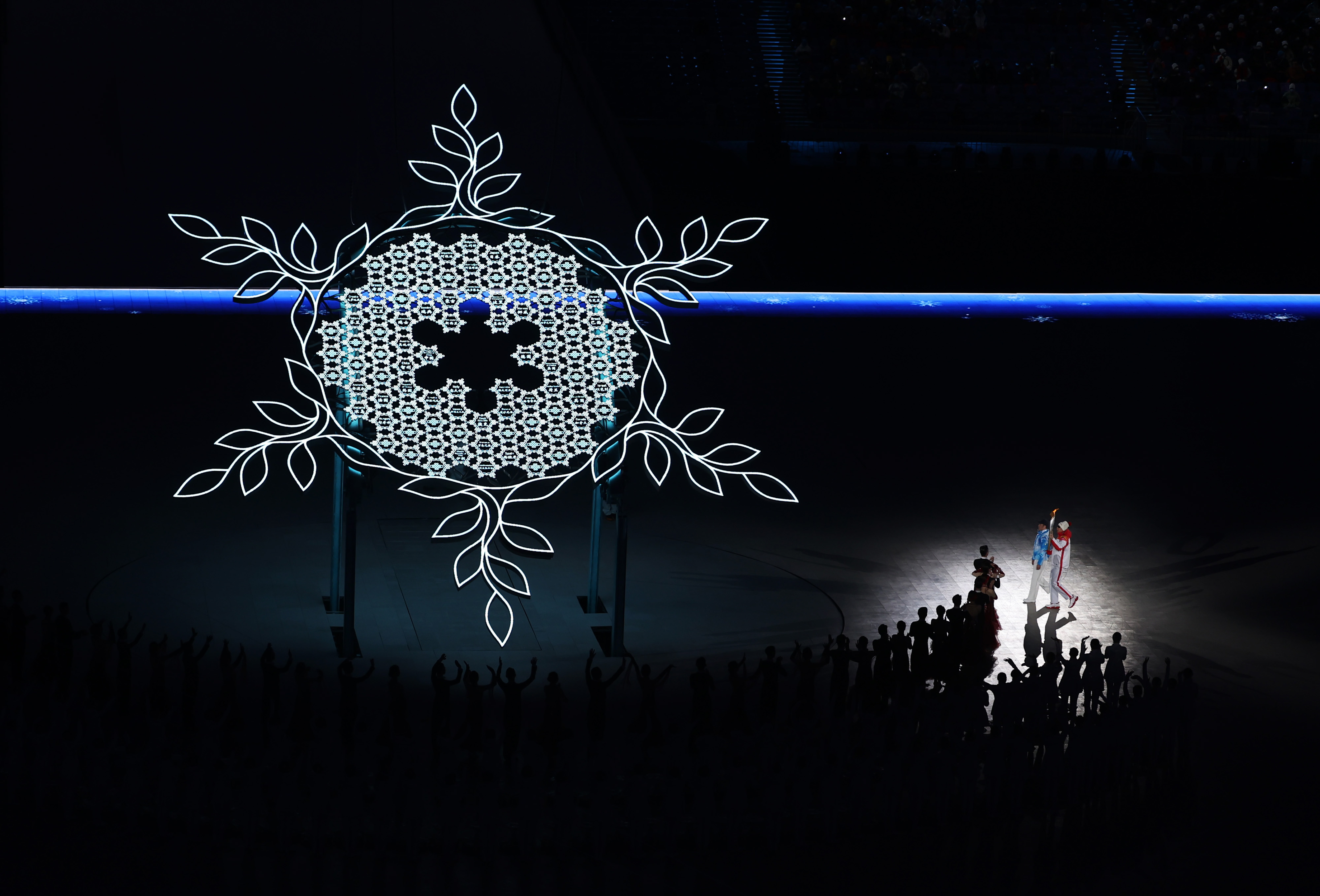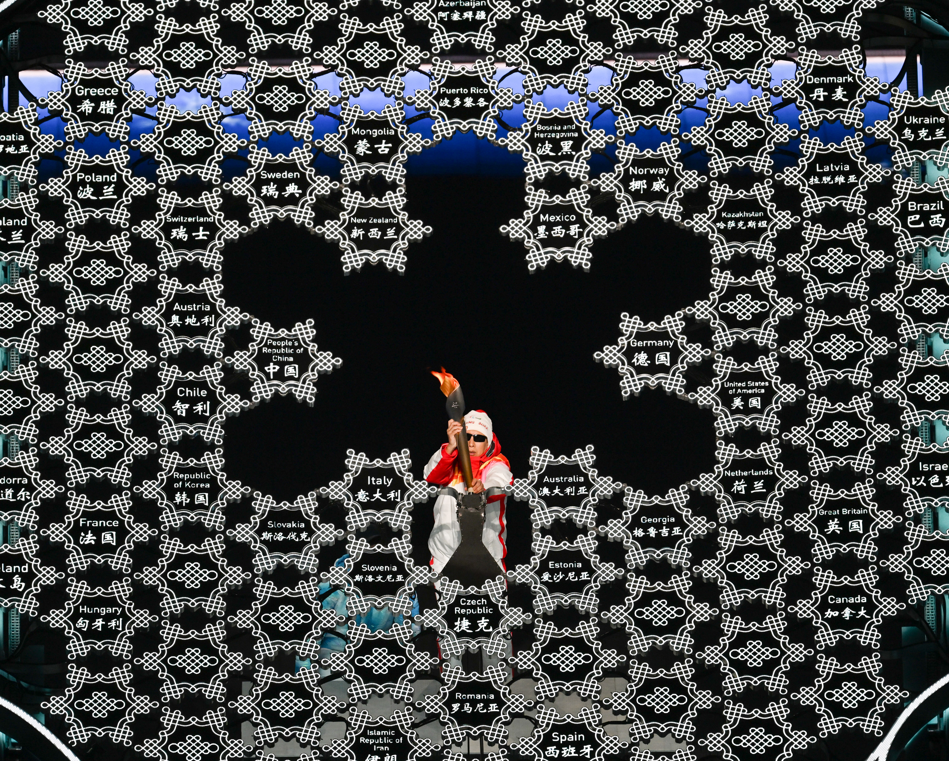 3月4日晚,最后一棒火炬手李端将火炬嵌入“大雪花”中央。新华社记者宋彦桦摄