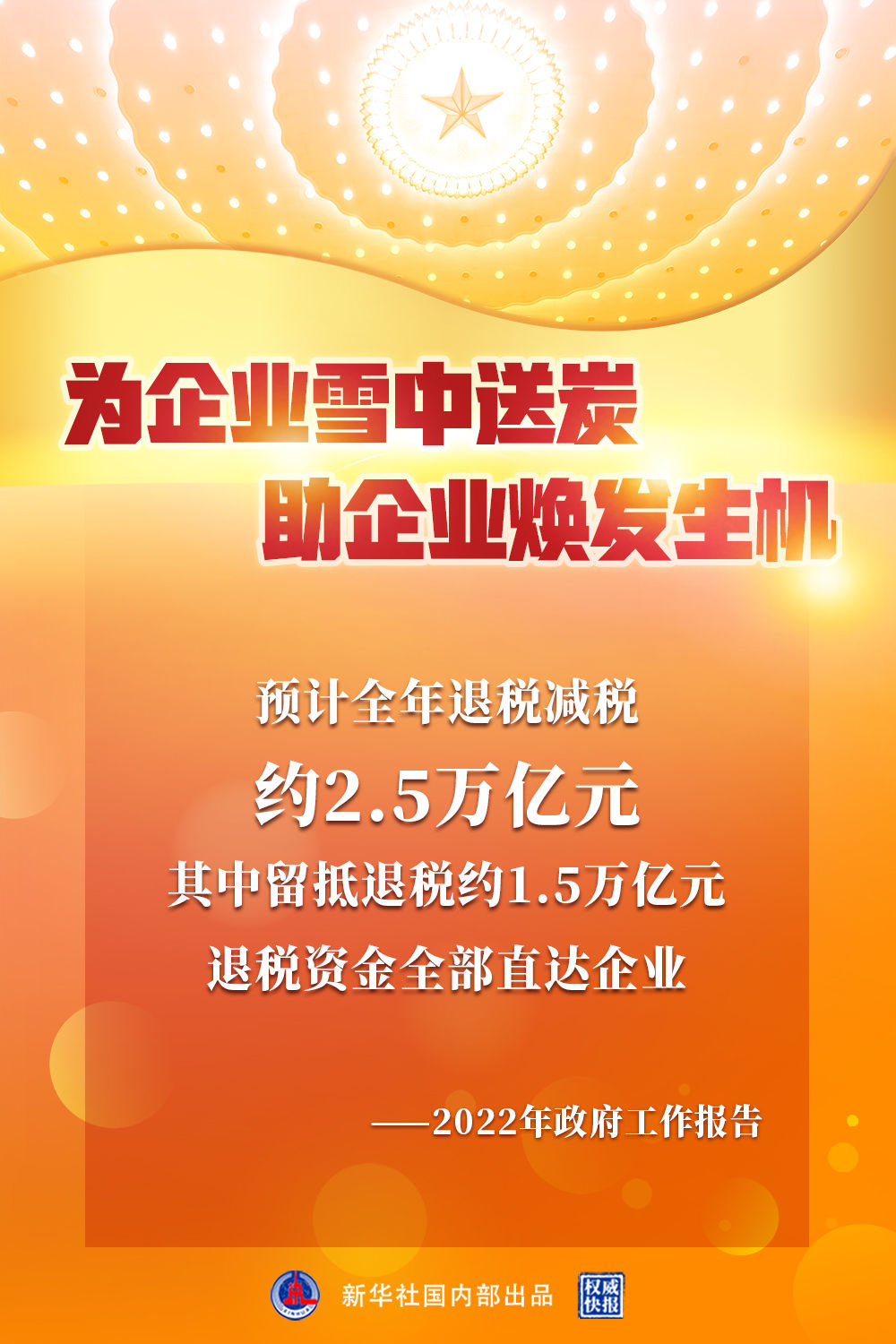 3月5日提请十三届全国人大五次会议审议的政府工作报告提出,预计全年退税减税约2.5万亿元,其中留抵退税约1.5万亿元,退税资金全部直达企业。