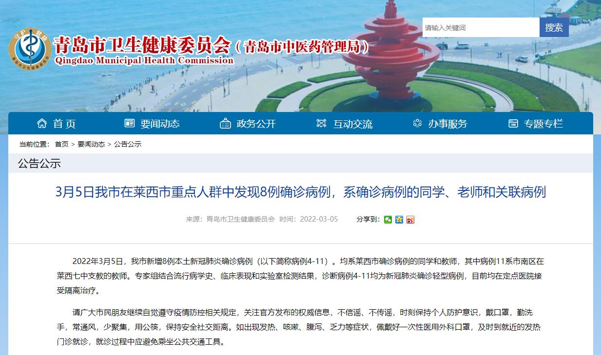 据青岛市卫健委通报,2022年3月5日,青岛市新增8例本土新冠肺炎确诊病例(以下简称病例4-11),均系莱西市确诊病例的同学和教师,其中病例11系市南区在莱西七中支教的教师。专家组结合流行病学史、临床表现和实验室检测结果,诊断病例4-11均为新冠肺炎确诊轻型病例,目前均在定点医院接受隔离治疗。