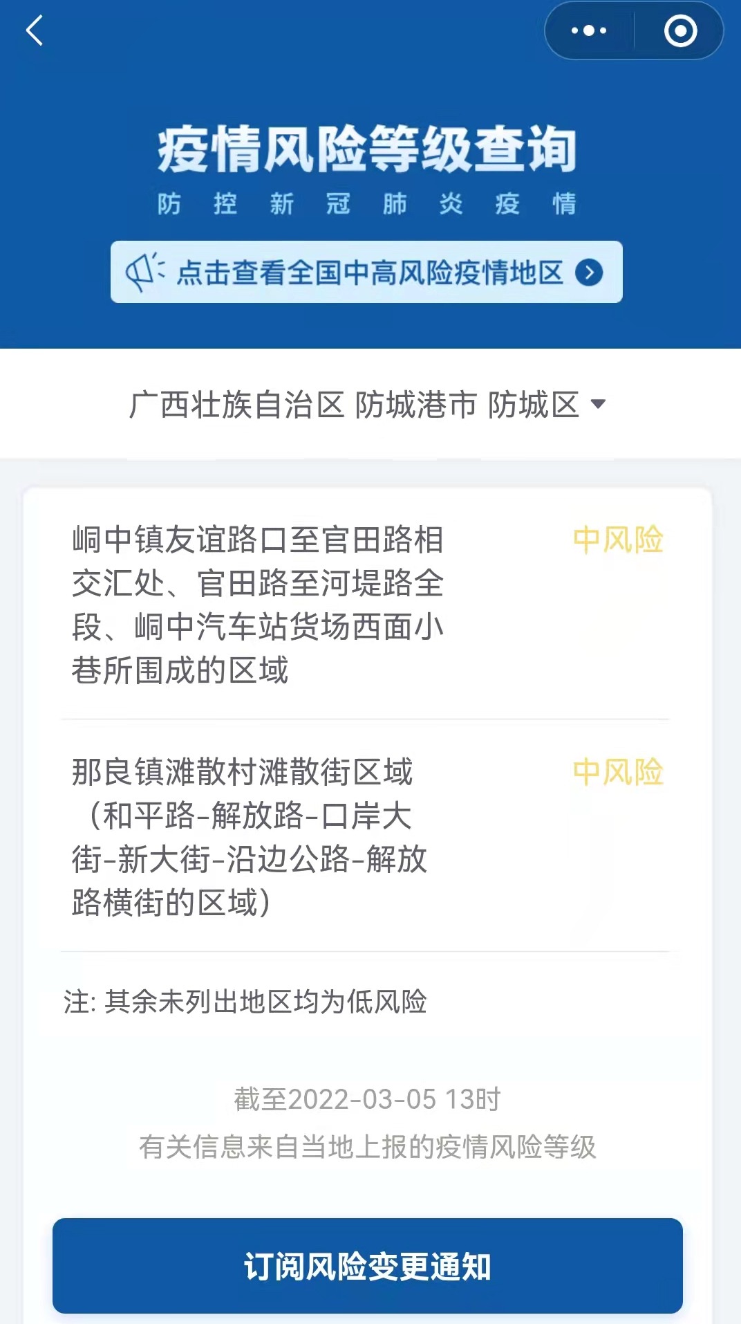 根据国务院客户端小程序消息,截至3月5日13时,广西防城港市防城区一地风险调整: