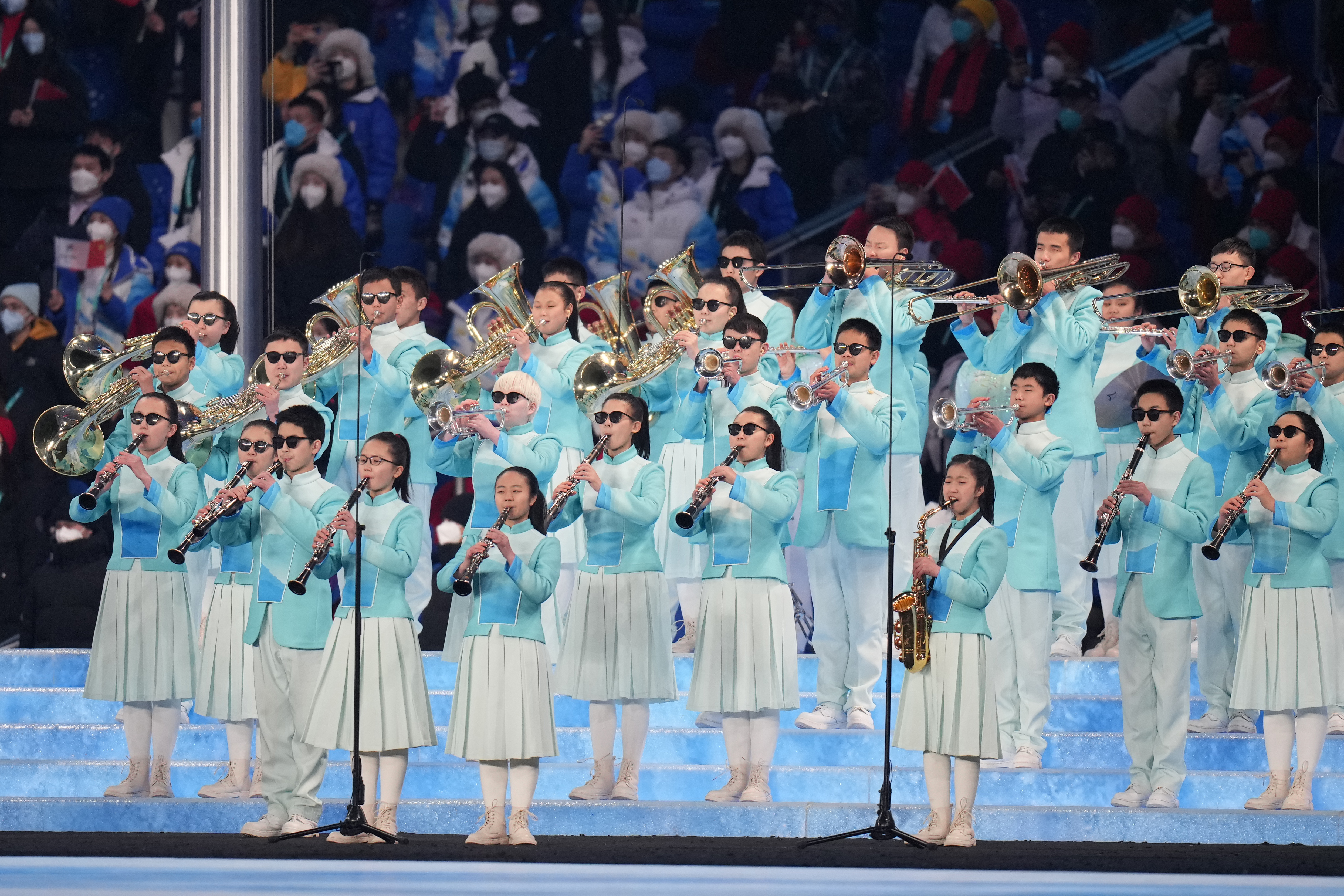 新华社照片,北京,2022年3月5日 (新华全媒+·北京冬残奥会)(1)这乐声,冲破黑暗直抵未来 3月4日晚,在北京国家体育场举行的北京2022年冬残奥会开幕式上,重庆市特殊教育中心扬帆管乐团奏响了国际残奥委会会歌——《未来赞美诗》。残奥会会旗冉冉升起,庄严磅礴的旋律回荡在体育场上空,向世界展示了中国残疾人昂扬奋进的精神风貌,传递着自强不息的中国力量。 这支管乐团里的视障学生,全部来自重庆市特殊教育中心。从去年11月接到演出任务到参加演出,一共是116天。扬帆管乐团从100余名团员中选拔出44名学生与3名老师参演。学生中年龄最大的22岁,最小的仅10岁。 扬帆管乐团成立于2011年,最初由34名老师、36名视障学生组成。历经10余年的发展,乐团现有学生70余人,已发展成为全球规模最大的盲人管乐团。 从1月中旬拿到乐谱到参加演出,一共只有49天时间。为视障学生读乐谱、录制有声乐谱的工作全部由本校老师承担。管乐团师生放弃了寒假休息,进行了高强度集训。师生同心,克服了时间短、任务重、难度大等困难,5天时间内完成了乐曲的首次排练。 2月8日赴北京集训以来,学生们在老师的陪护下,克服了天气寒冷、气候干燥的困难和饮食上的不习惯,始终以饱满的热情投入到训练之中。 台上一分钟,台下十年功。改编后的国际残奥委会会歌《未来赞美诗》标准演奏时长1分58秒。为了完美地展现这1分58秒,记谱、演奏、排练还只是完成了第一步。对于视障学生而言,最大的困难是站立、队列行走和持乐器姿势的训练、表情的管理。 还有就是要适应低温环境下的演奏。3月4日开幕式当天,鸟巢夜间温度大约只有1℃,孩子们要适应在寒冷的环境中长时间站立,为此管乐团每天在室外训练达半个小时,向中国人民解放军军乐团老师请教如何给乐器保温。 封闭的生活环境、艰苦的训练、高强度的联排,孩子们都一关一关地闯了过来。问他们苦不苦,累不累,他们都会回答:苦,累,但是值得!因为他们知道肩上担负着沉甸甸的责任,承载着满满的爱与期待。能够亲身参与到残奥盛会中,这份荣耀也值得每一个人全力以赴。 他们看不见世界,但他们的努力,世界看见了! 图为在北京2022年冬残奥会开幕式上,重庆市特殊教育中心扬帆管乐团参演团队演奏国际残奥委会会歌(3月4日摄)。 新华社记者 吴壮 摄