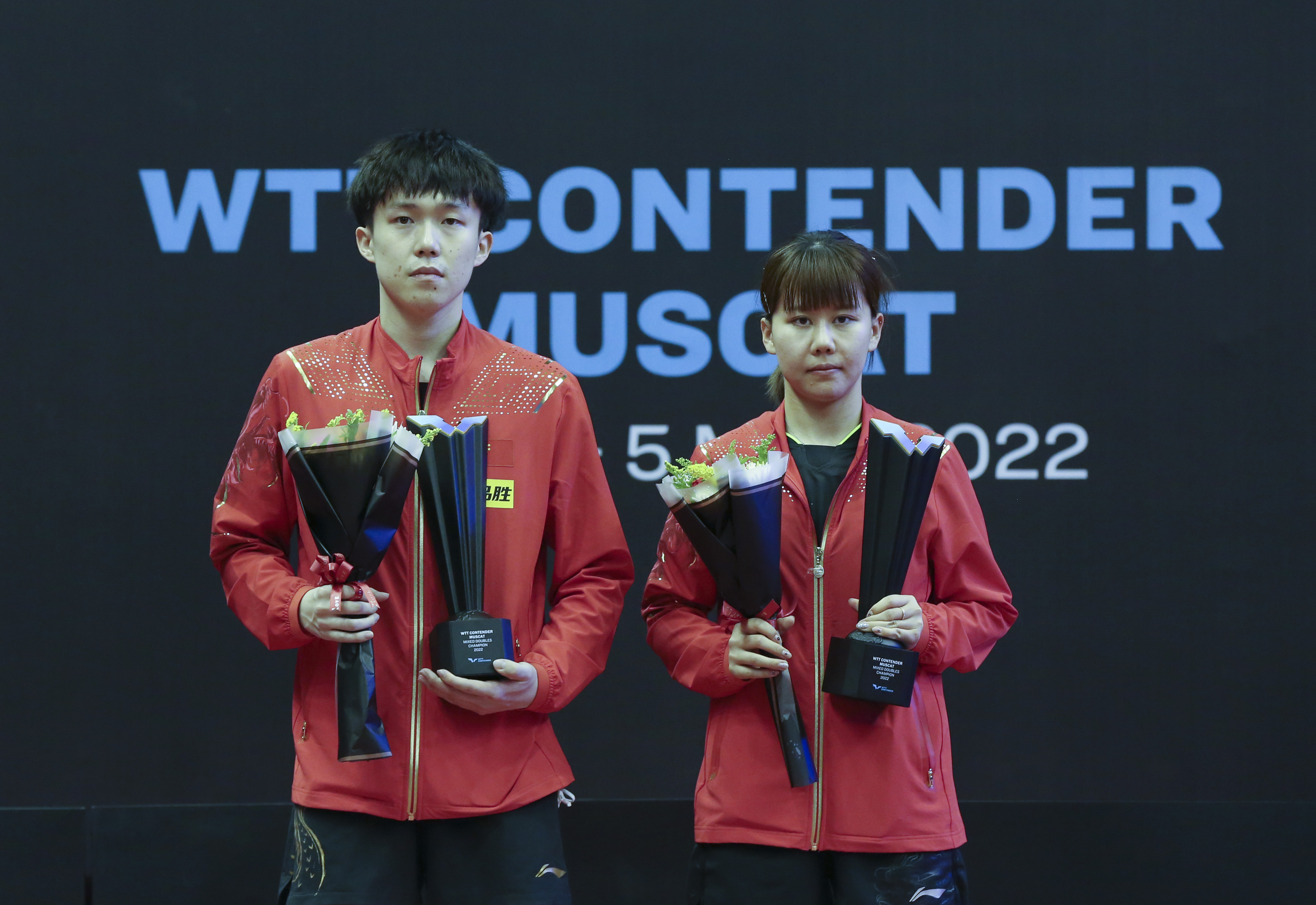 3月4日,中国选手王楚钦(左)和陈幸同在颁奖台上留影。新华社发(哈立德摄)
