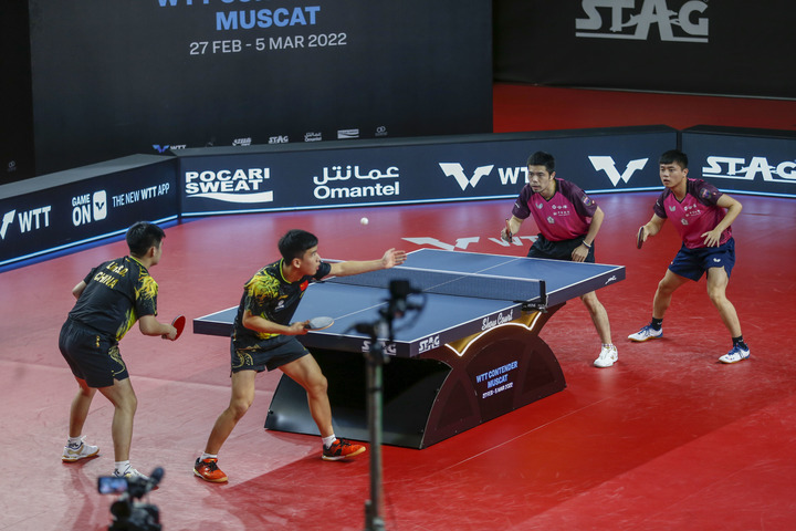 3月5日,向鹏(左二)/林诗栋(左一)与庄智渊(右二)/彭王维在2022年WTT挑战赛马斯喀特站男双决赛中。新华社发(哈立德摄)