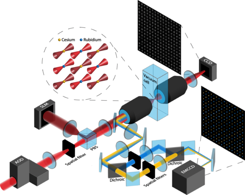 在由两种不同元素的原子组成的混合阵列中,相邻两个原子可以是不同元素,具有完全不同的频率。这使得研究人员更容易测量和操作单个原子,而不受周围原子的干扰。芝加哥大学团队使用512个光镊捕获铷原子、铯原子各256个,并观察到两个元素之间的干扰能够忽略不计。