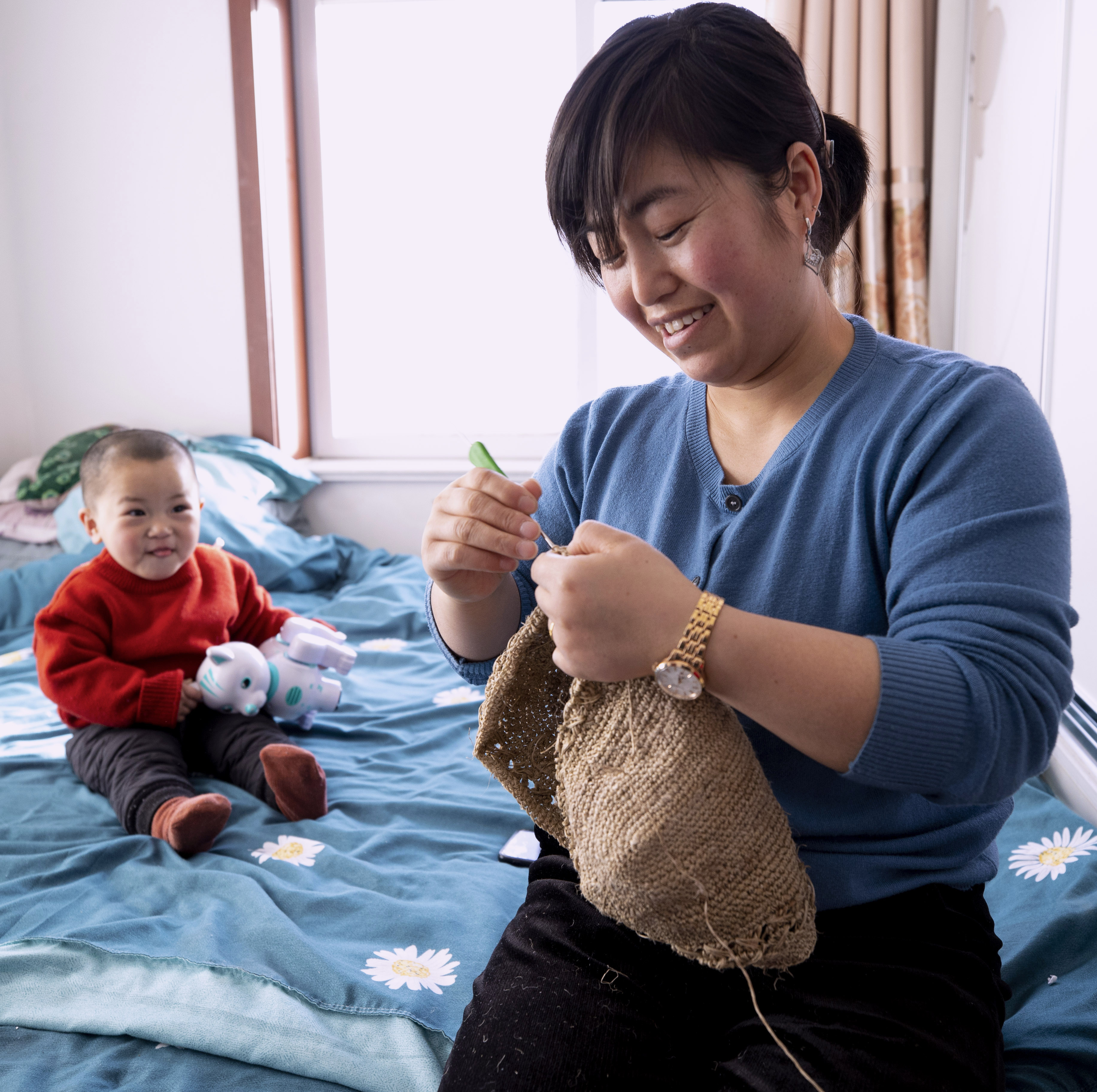 新华社照片,银川,2022年3月6日 宁夏月牙湖:麻编文创传递“她”力量 在宁夏银川市月牙湖乡滨河家园四村,村民虎海霞在家中一边编织汉麻背包一边带孩子(3月4日摄)。 2017年底,自治区级麻编非遗传承人张璟来到位于黄河东岸的银川市月牙湖乡,开设麻编培训班吸收村民学员,并成立了非遗麻编手工坊,学员以妇女居多,最小的26岁,最大的70多岁。 几年来,张璟奔走于银川市区与月牙湖乡之间,为村民们传授技艺并送去原材料,再将大家编好的粗加工产品带回,进行后期加工,设计制作出手包、收纳筐、钥匙扣等生活用品,还结合宁夏地域文化制作出文创产品。 张璟为村民学员们制作专属名牌作为标签与产品一同销售,每件产品可追溯到村民个人,这一举措有助于让人们更多地了解乡亲们的手作技艺。 通过学习非遗技艺,月牙湖乡的妇女们在掌握一门手艺的同时,坚定了自力更生的生活信念,提升了艺术修养,精神面貌有了很大的改变。“精神、文化上带来的满足比经济效益更高、更珍贵。”张璟说。 新华社记者 杨植森 摄