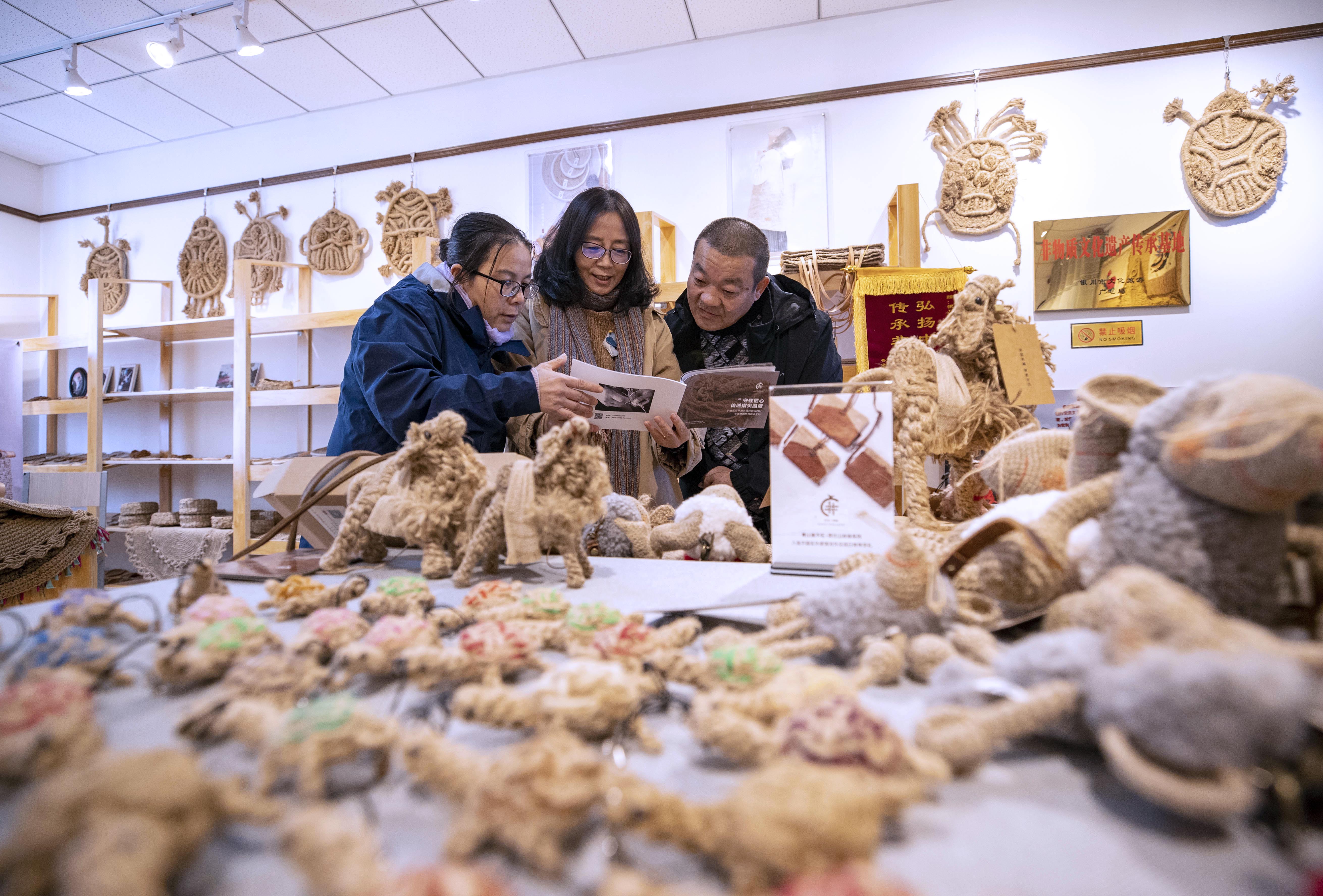 新华社照片,银川,2022年3月6日 宁夏月牙湖:麻编文创传递“她”力量 在宁夏银川市月牙湖乡滨河家园四村非遗麻编手工坊的展示厅内,张璟(中)向参观游客介绍当地村民与非遗麻编的故事(3月4日摄)。 2017年底,自治区级麻编非遗传承人张璟来到位于黄河东岸的银川市月牙湖乡,开设麻编培训班吸收村民学员,并成立了非遗麻编手工坊,学员以妇女居多,最小的26岁,最大的70多岁。 几年来,张璟奔走于银川市区与月牙湖乡之间,为村民们传授技艺并送去原材料,再将大家编好的粗加工产品带回,进行后期加工,设计制作出手包、收纳筐、钥匙扣等生活用品,还结合宁夏地域文化制作出文创产品。 张璟为村民学员们制作专属名牌作为标签与产品一同销售,每件产品可追溯到村民个人,这一举措有助于让人们更多地了解乡亲们的手作技艺。 通过学习非遗技艺,月牙湖乡的妇女们在掌握一门手艺的同时,坚定了自力更生的生活信念,提升了艺术修养,精神面貌有了很大的改变。“精神、文化上带来的满足比经济效益更高、更珍贵。”张璟说。 新华社记者 杨植森 摄