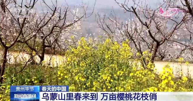 央视网消息:跟随镜头,我们来到贵州毕节市的九洞天万亩樱桃林。初春时节,雪白的樱桃花次第开放,铺满山谷。树下漫山遍野的油菜花也在春风的吹拂下绽放金黄,与樱桃花相映成趣,分外美丽。