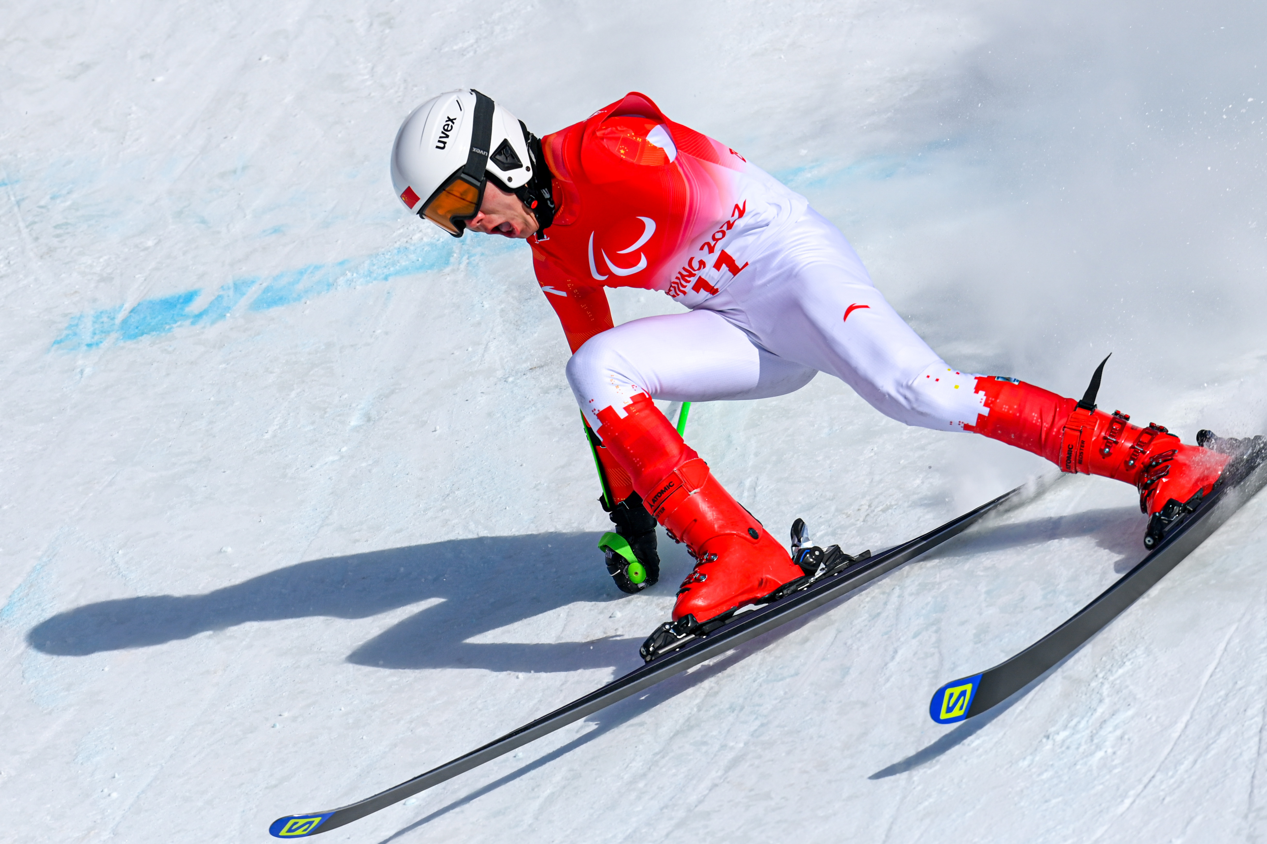 3月6日,中国选手梁景怡在北京冬残奥会高山滑雪男子超级大回转(站姿)项目比赛中。新华社记者江汉摄