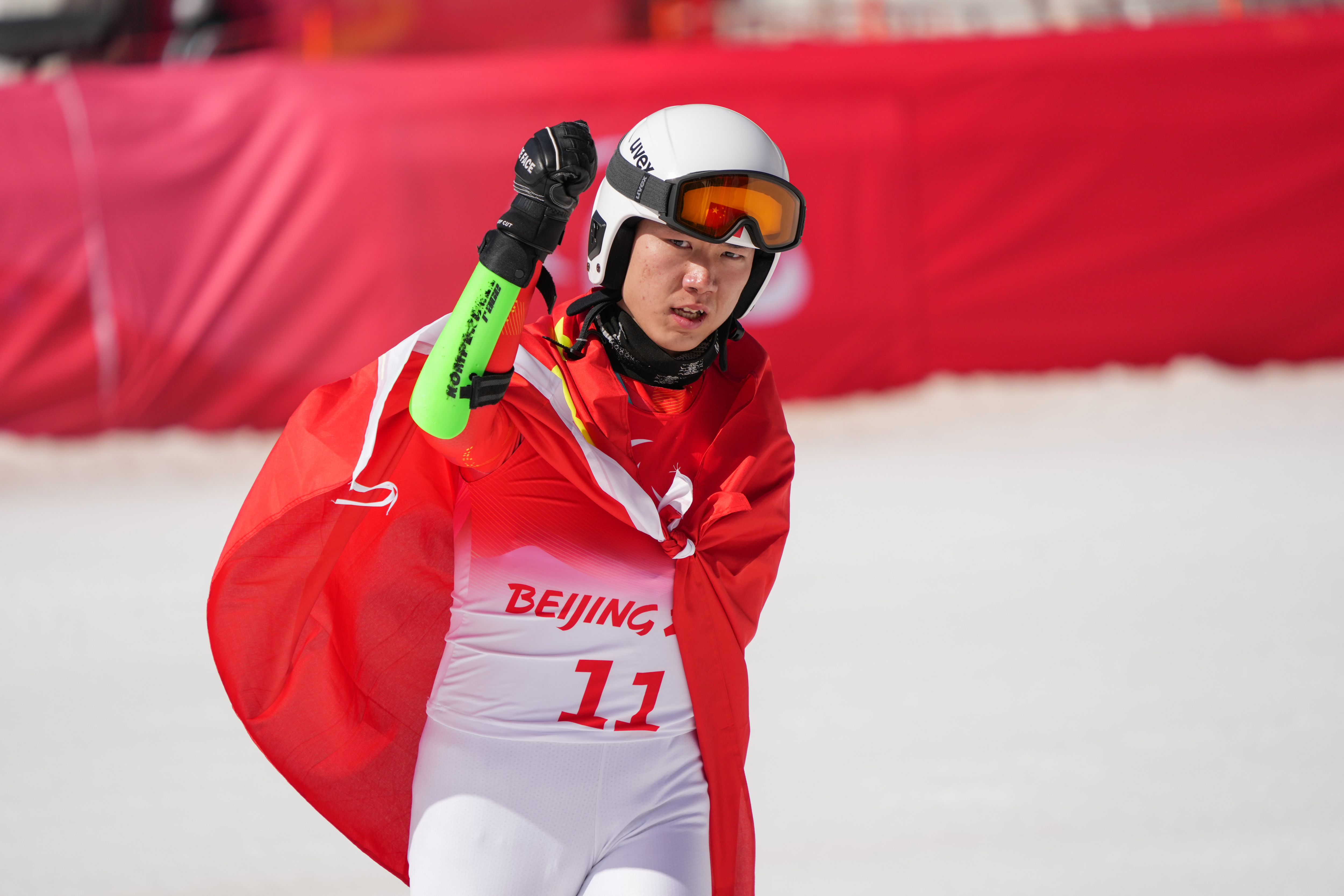 3月6日,中国选手梁景怡在北京冬残奥会高山滑雪男子超级大回转(站姿)项目比赛后庆祝。新华社记者孙非摄