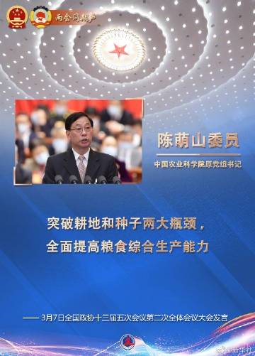 #2022两会同期声##突破耕地和种子两大瓶颈#7日上午,全国政协十三届五次会议举行第二次全体会议。12名委员作大会发言。陈萌山委员发言。#全国两会2022#