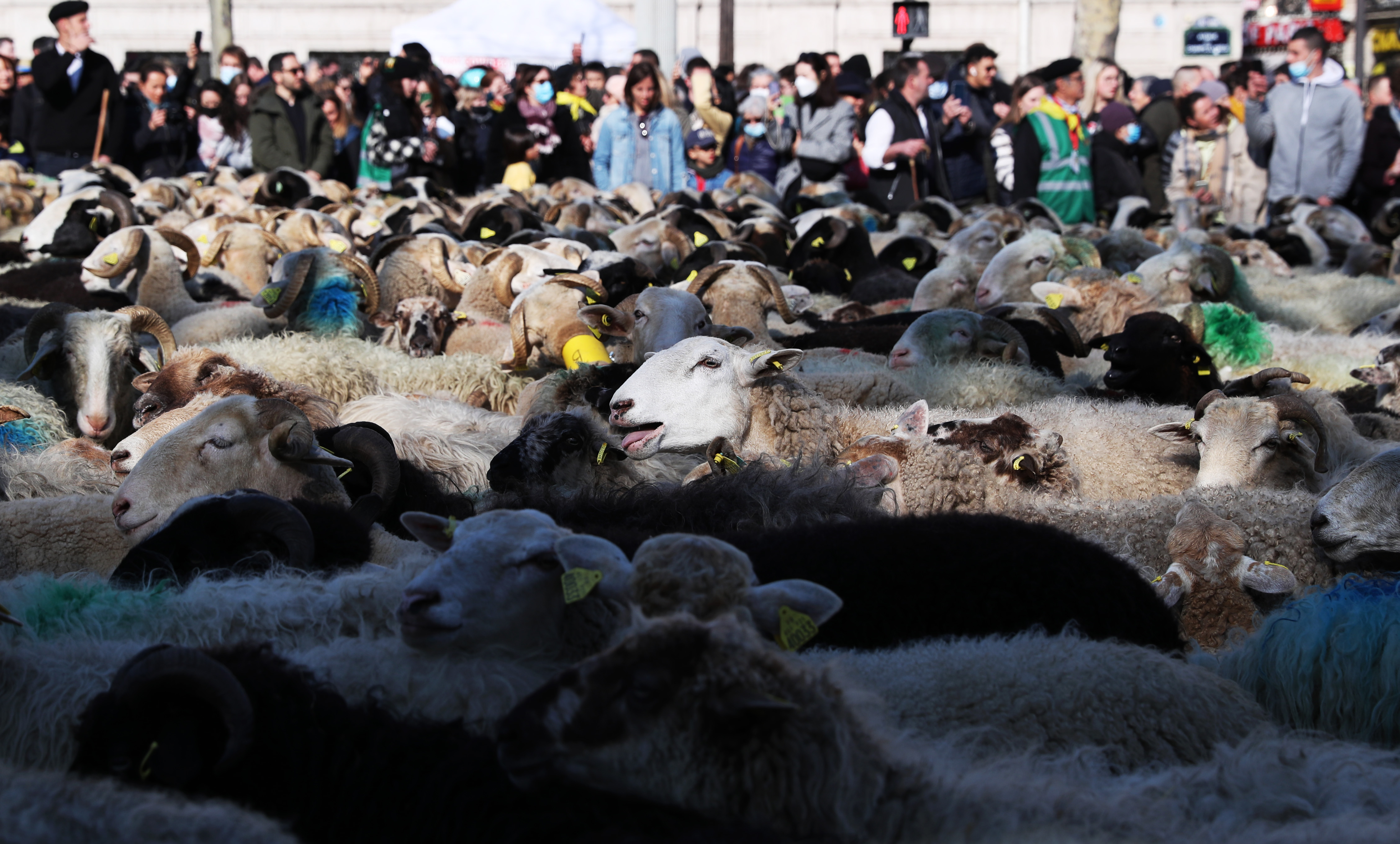 新华社照片,巴黎,2022年3月7日 (国际)(4)巴黎:2022只绵羊亮相香街 3月6日,绵羊聚集在法国巴黎香榭丽舍大街上。 2022只绵羊当天出现在法国巴黎著名的香榭丽舍大街上,吸引众多市民前来围观。这场别开生面的活动是第58届法国国际农业博览会的闭幕活动。 新华社记者 高静 摄