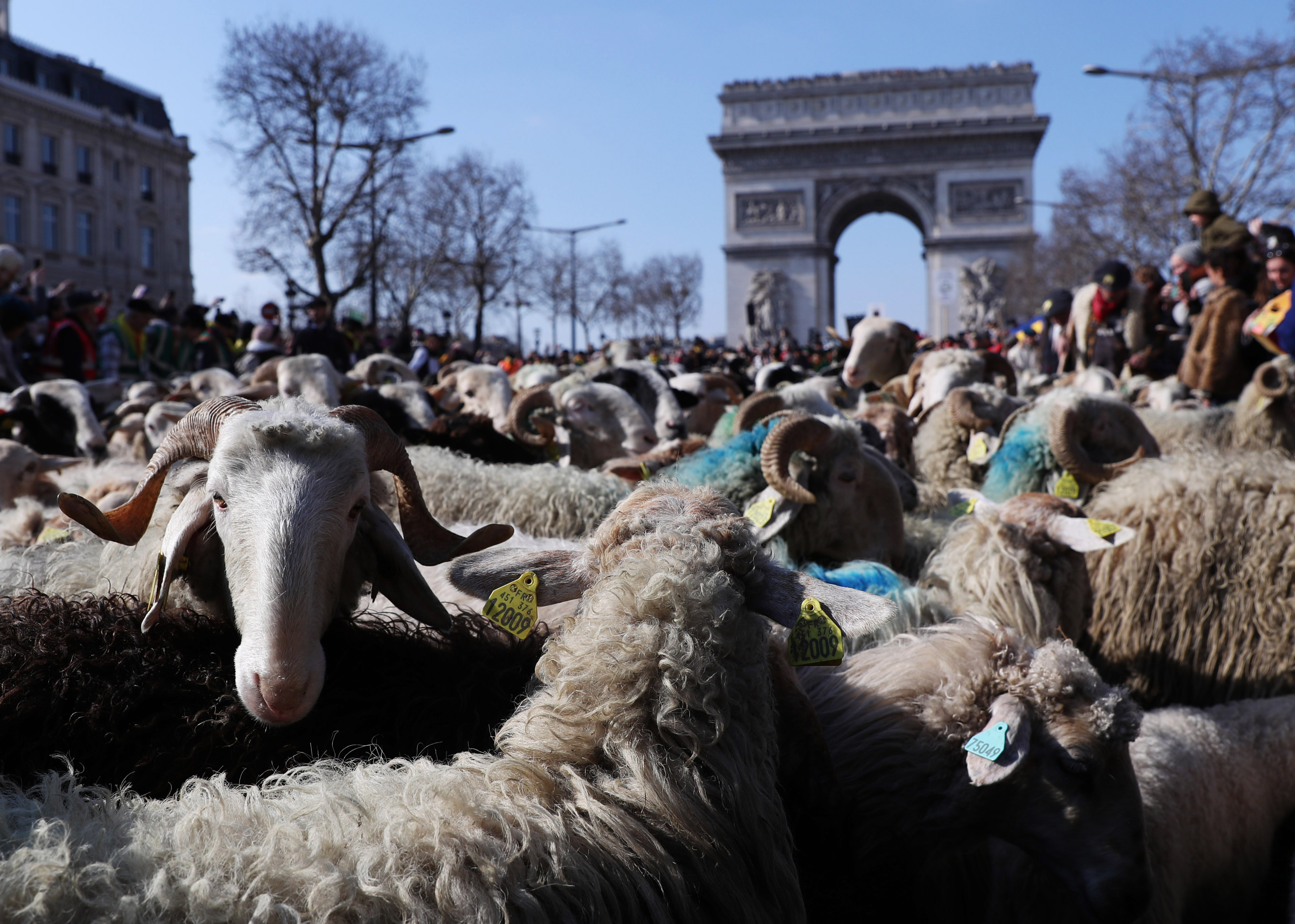 新华社照片,巴黎,2022年3月7日 (国际)(5)巴黎:2022只绵羊亮相香街 3月6日,绵羊聚集在法国巴黎香榭丽舍大街上。 2022只绵羊当天出现在法国巴黎著名的香榭丽舍大街上,吸引众多市民前来围观。这场别开生面的活动是第58届法国国际农业博览会的闭幕活动。 新华社记者 高静 摄