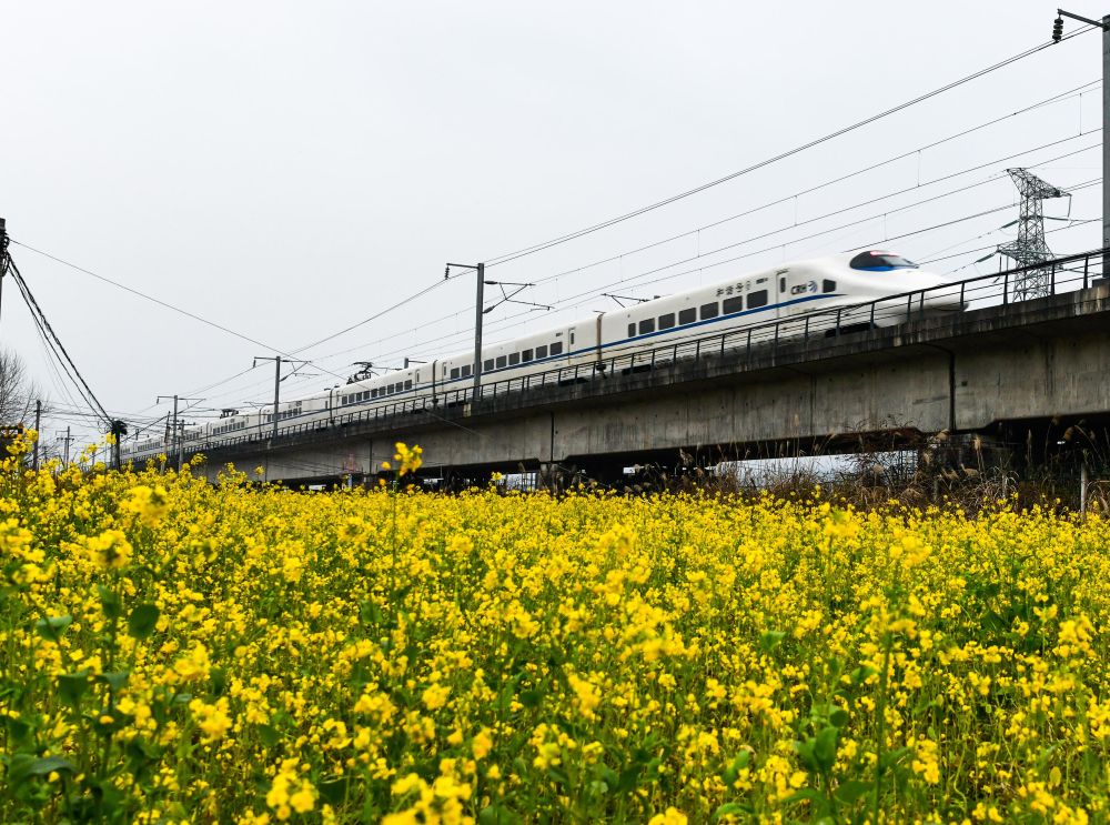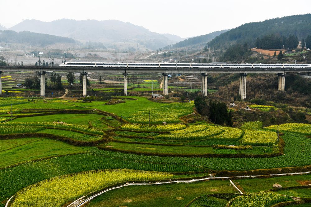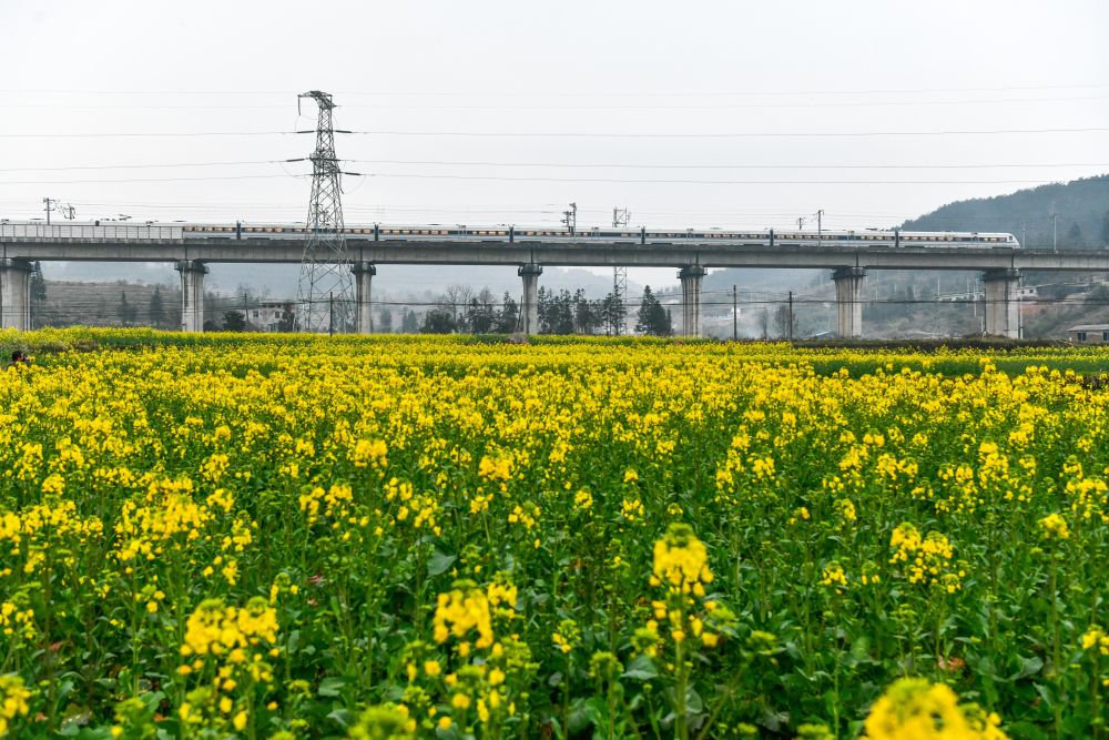 春暖花开时节,贵州省境内的油菜花陆续盛开,列车穿行其间,美不胜收。