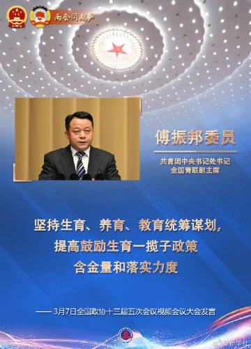 #2022两会同期声##提高鼓励生育一揽子政策含金量和落实力度#7日下午,全国政协十三届五次会议举行视频会议。12名委员作大会发言。傅振邦委员代表共青团界发言。#全国两会2022#
