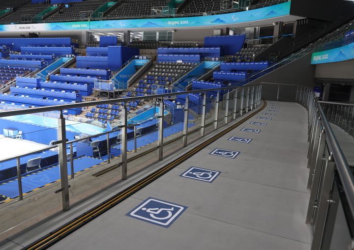 承担着北京赛区冰上项目比赛的国家游泳中心“冰立方”和国家体育馆从冬奥会向冬残奥会转换期开始,便作好了一系列有关无障碍环境的准备。场馆内部,无论是通往比赛场区的运动员通道,还是看台区域,都设有无障碍坡道。这些坡道的宽度以及地面铺设的防滑材料都有助于残障人士使用轮椅出行。“我们的无障碍设施从运动员们下车开始,到他们完成最后的采访回到休息室休息,这一路都是贯穿始终的,可以说能够做到全覆盖。”国家游泳中心无障碍设施经理刘振铎说。