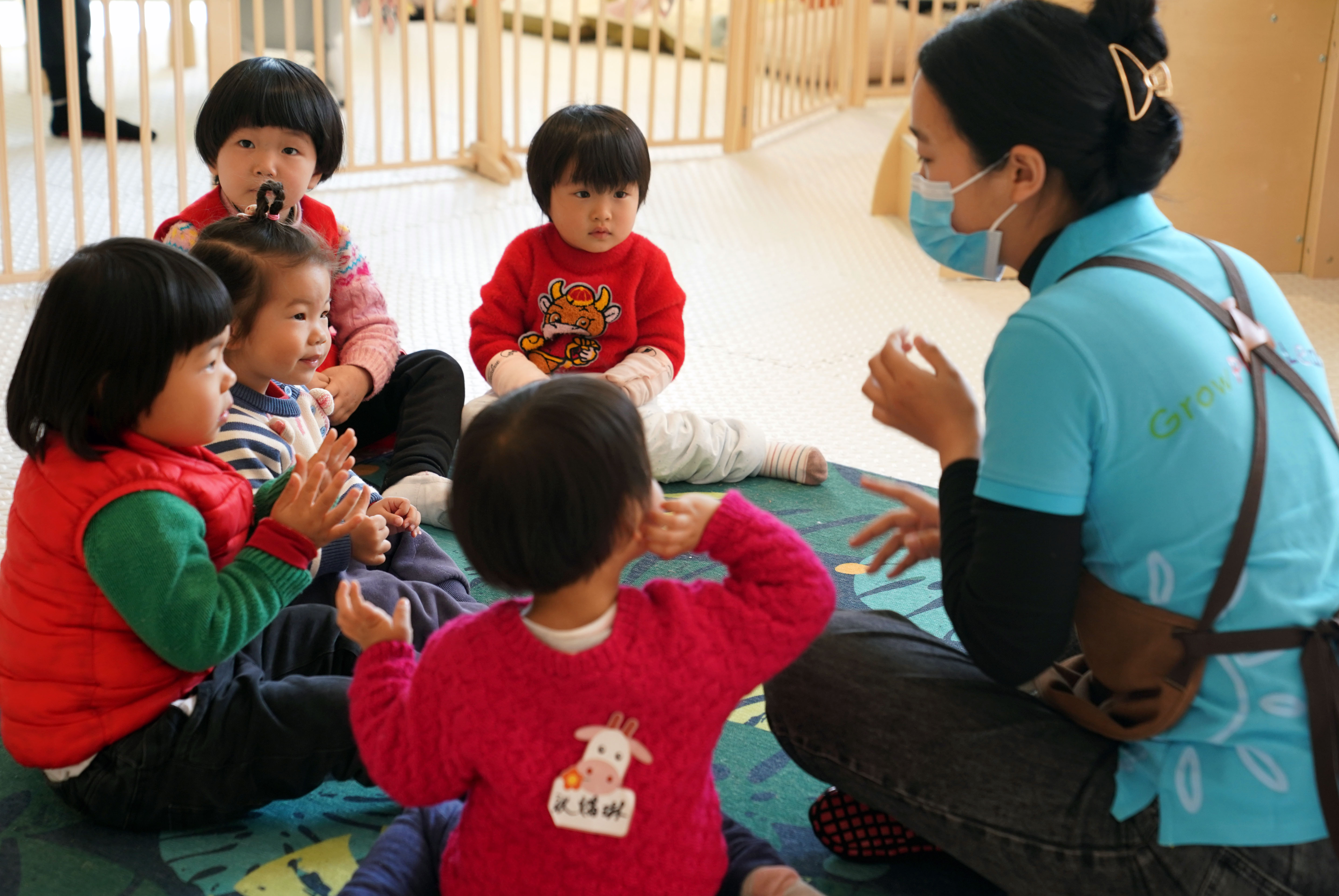 新华社照片,上海,2022年3月7日 上海静安:社区“宝宝屋”投入使用 3月7日,在江宁路街道社区综合为老服务中心,“宝宝屋”的看护人员带领小朋友们玩游戏。 近日,上海市静安区江宁路街道的首批两家“宝宝屋”分别在社区党群服务中心和综合为老服务中心开始试运营。这是静安区教育局与江宁路街道合作试点的首批公益普惠的社区“宝宝屋”,为有幼儿的家庭提供临时性、计时制的集中照护和育儿指导服务,缓解临时性托育难题。 新华社记者 刘颖 摄