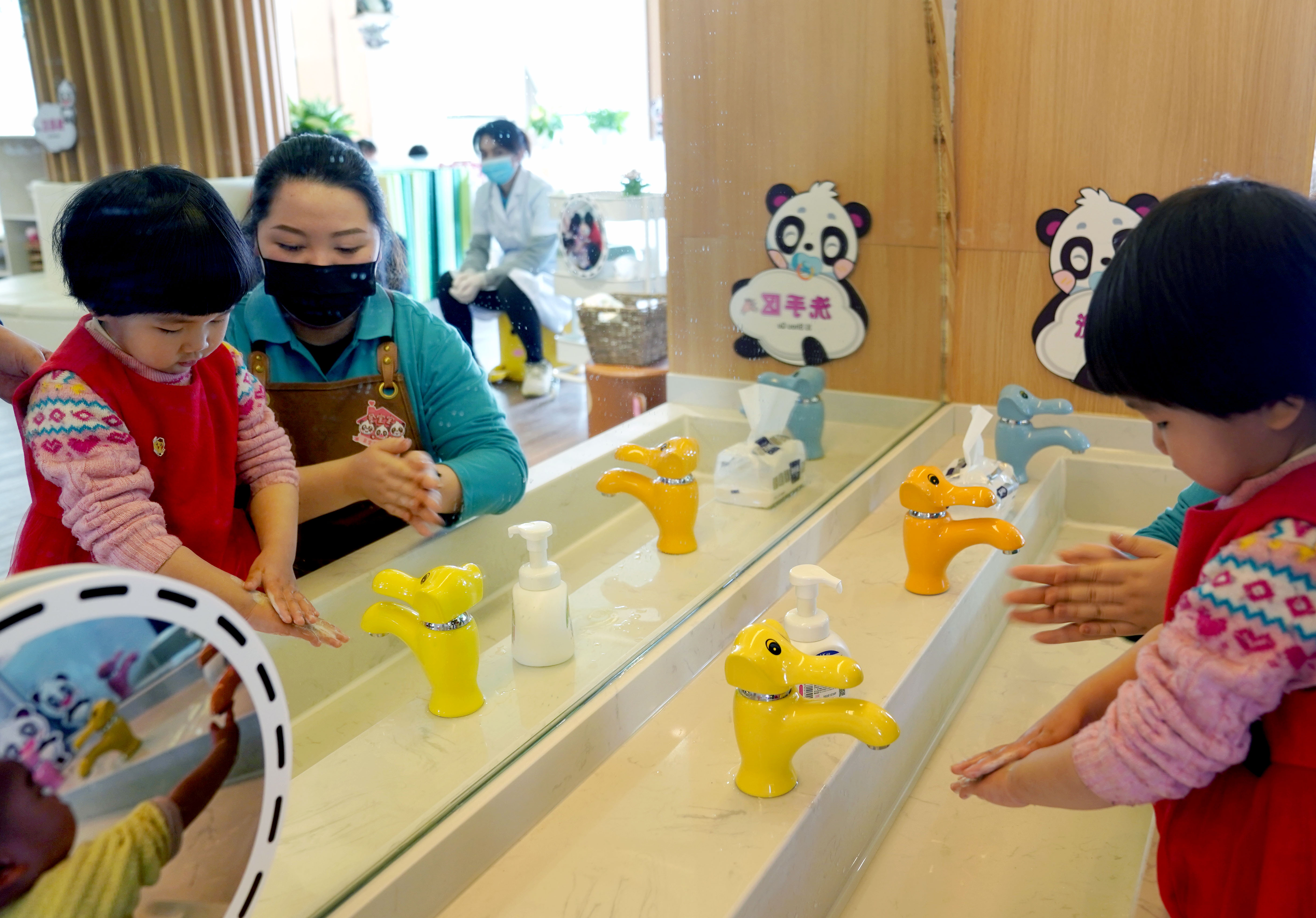 新华社照片,上海,2022年3月7日 上海静安:社区“宝宝屋”投入使用 3月7日,在江宁路街道社区综合为老服务中心,“宝宝屋”的看护人员教小朋友洗手。 近日,上海市静安区江宁路街道的首批两家“宝宝屋”分别在社区党群服务中心和综合为老服务中心开始试运营。这是静安区教育局与江宁路街道合作试点的首批公益普惠的社区“宝宝屋”,为有幼儿的家庭提供临时性、计时制的集中照护和育儿指导服务,缓解临时性托育难题。 新华社记者 刘颖 摄
