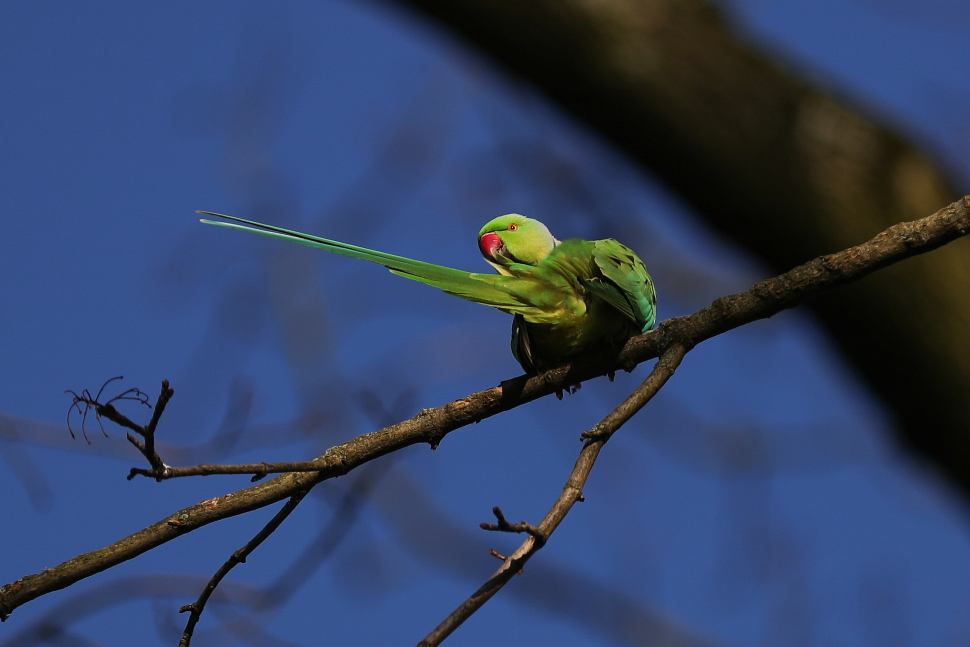 新华社照片,布鲁塞尔,2022年3月7日 (国际)(2)布鲁塞尔:早春时节 3月7日,在比利时布鲁塞尔的五十周年纪念公园,一只鹦鹉在树上栖息。 时下的比利时布鲁塞尔正值早春时节,万物复苏,鸟鸣嘤嘤。 新华社记者 郑焕松 摄