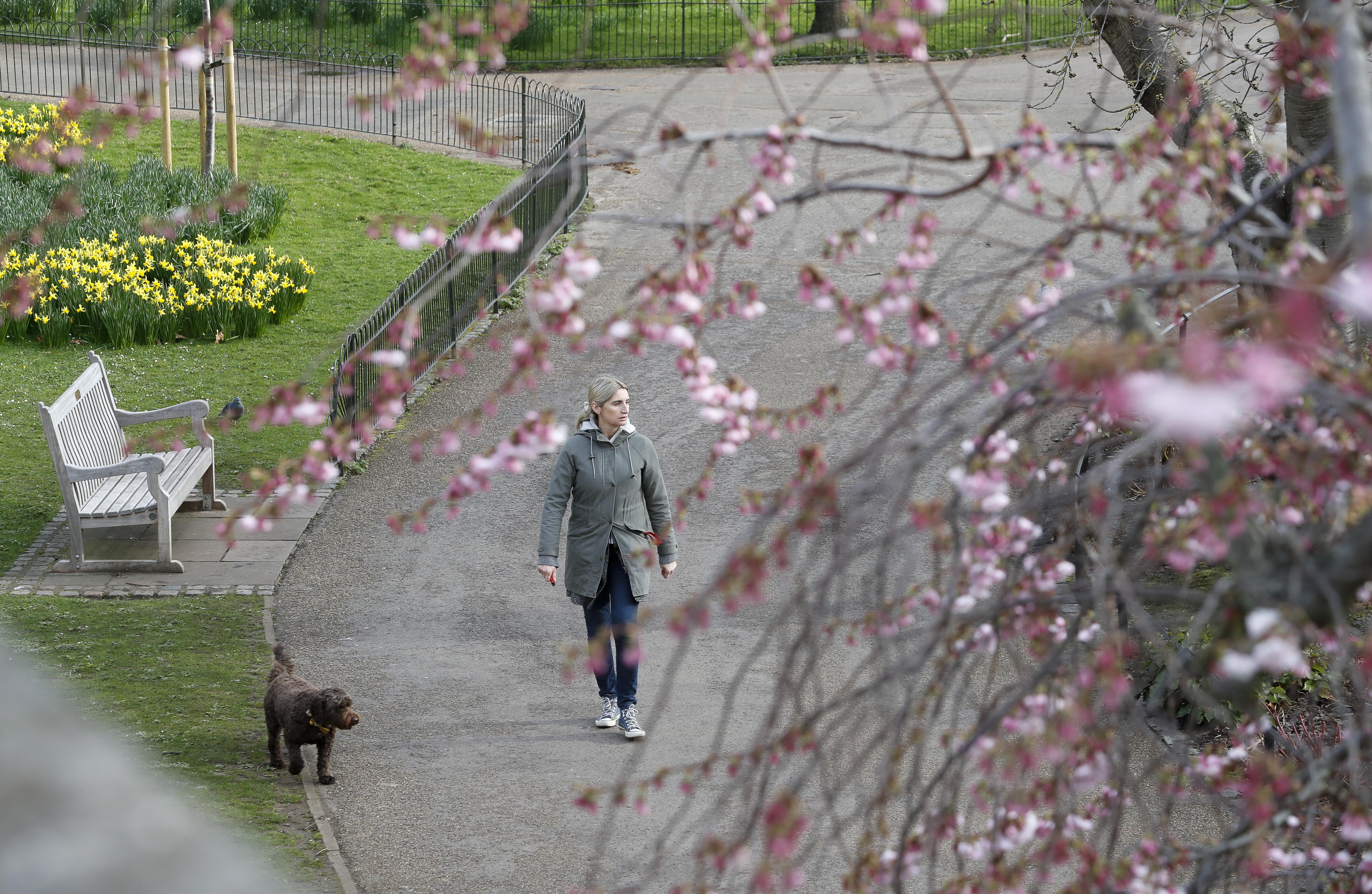 新华社照片,伦敦,2022年3月7日 (国际)(3)伦敦:春暖花开 3月7日,一名女子与小狗走在英国伦敦市中心的公园里。 英国伦敦春暖花开,生机勃勃。 新华社记者 韩岩 摄
