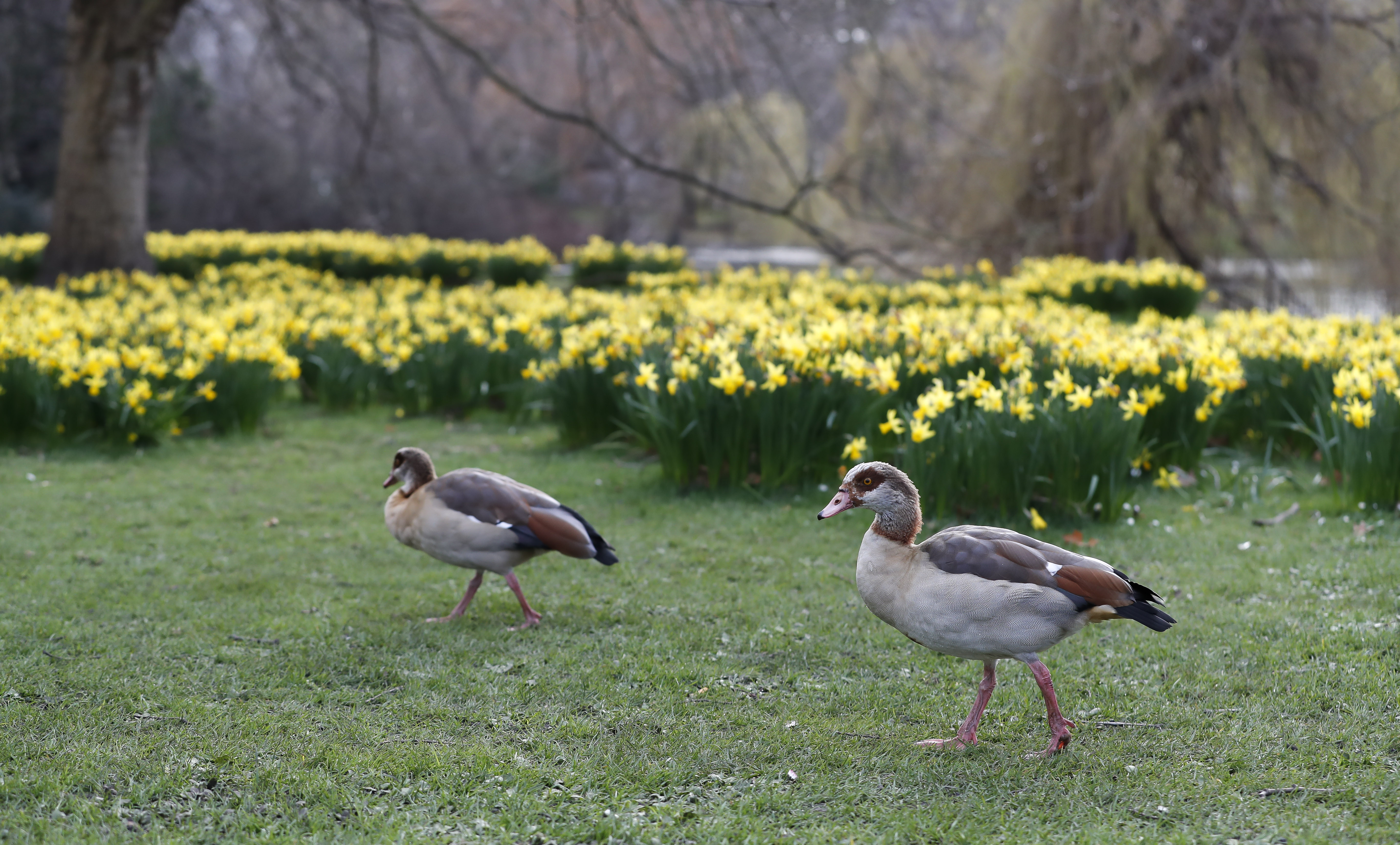 新华社照片,伦敦,2022年3月7日 (国际)(2)伦敦:春暖花开 3月7日,水禽走在英国伦敦市中心公园的花丛中。 英国伦敦春暖花开,生机勃勃。 新华社记者 韩岩 摄