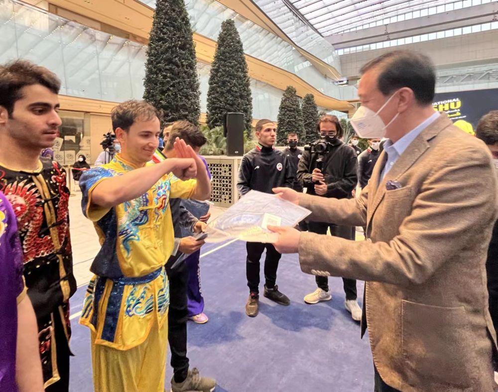 3月6日,中国驻伊朗大使常华(右)向伊朗武术爱好者赠送礼物。新华社发(中国驻伊朗大使馆供图)
