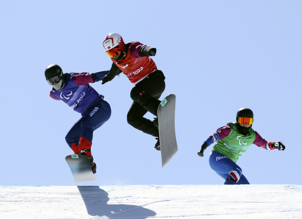 3月7日,获得亚军的中国选手王鹏耀(中)在残奥单板滑雪男子障碍追逐UL级四分之一决赛中。新华社记者兰红光摄
