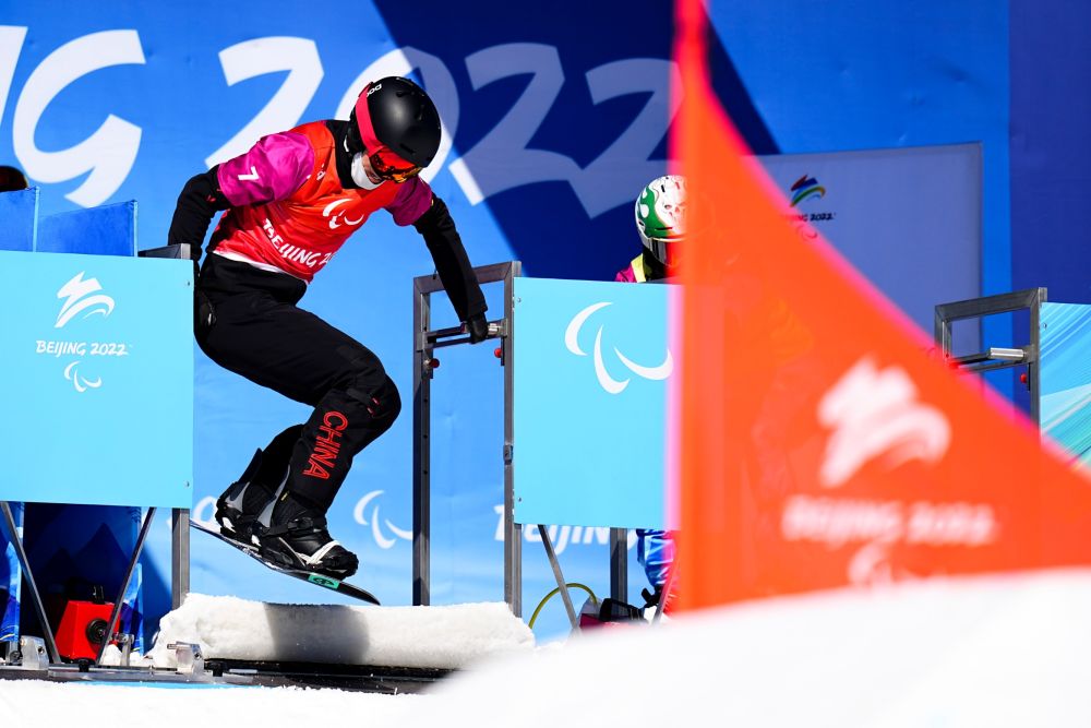 3月7日,冠军中国选手纪立家在残奥单板滑雪男子障碍追逐UL级决赛中出发。新华社记者许畅摄