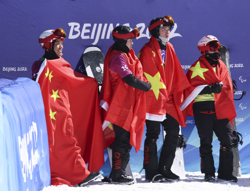四面五星红旗分别披在四位选手身上,他们享受着来自场内四面八方的欢呼。他们的名字是纪立家、王鹏耀、朱永钢、张义琦,他们是北京冬残奥会残奥单板滑雪男子障碍追逐UL级比赛大决赛的全部四名参赛选手,冠亚季殿军获得者。