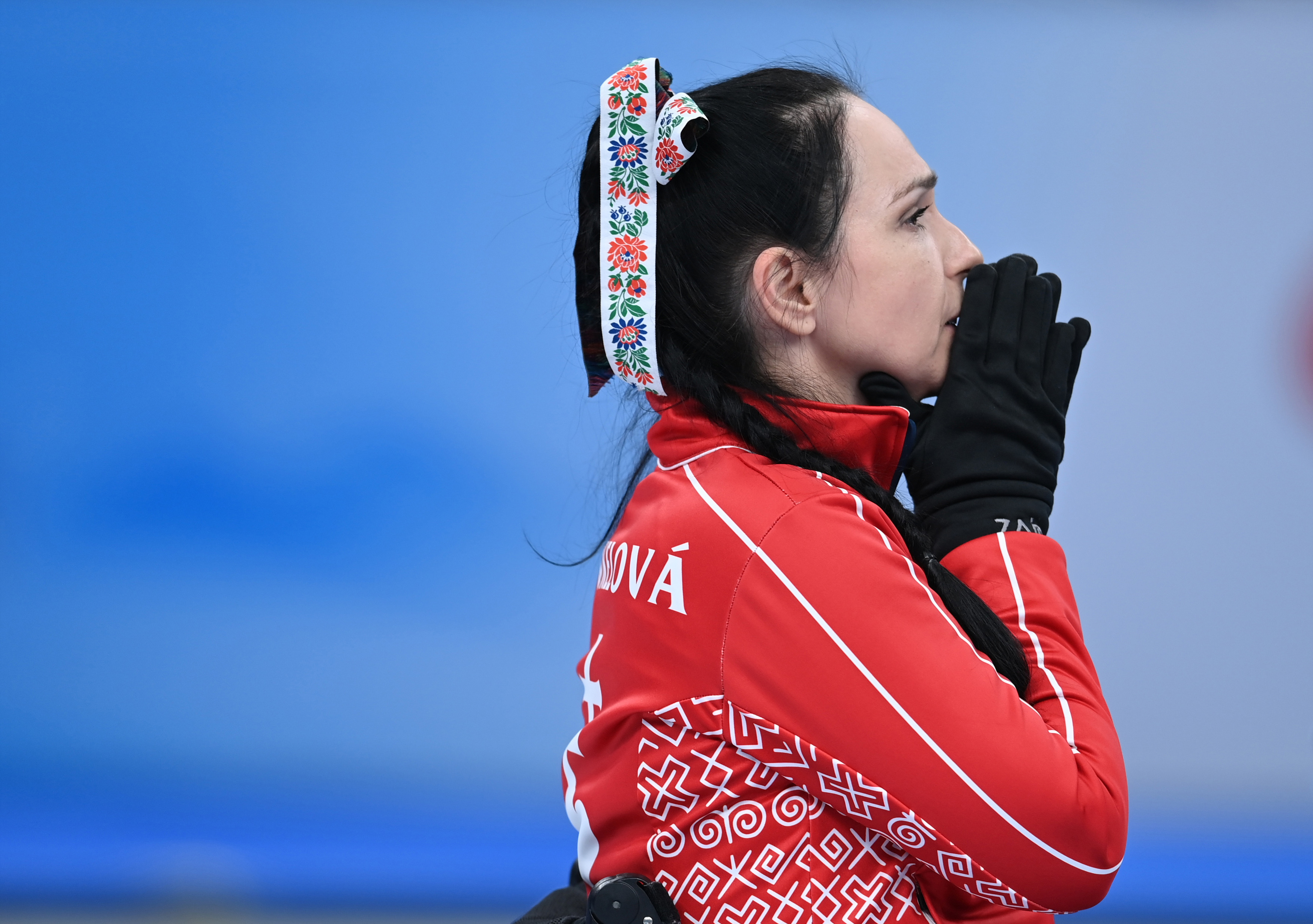 新华社照片,北京,2022年3月7日 (新华全媒+·北京冬残奥会)(5)轮椅上的“倩影”闪耀“冰立方” “三八”国际劳动妇女节前夕,北京2022年冬残奥会轮椅冰壶比赛在国家游泳中心“冰立方”激战正酣。轮椅冰壶赛制要求每队至少有1名女队员参赛。这些坐在轮椅上的女运动员在赛场内外流露出的坚毅眼神、灿烂笑容以及身上佩戴的特色配饰,都展现出她们自强、自信、乐观的精神面貌,以及对体育运动的热衷、对生活的热爱。 斯洛伐克队选手莫妮卡·孔克洛娃在轮椅冰壶循环赛中(3月5日摄)。 新华社记者 张博文 摄